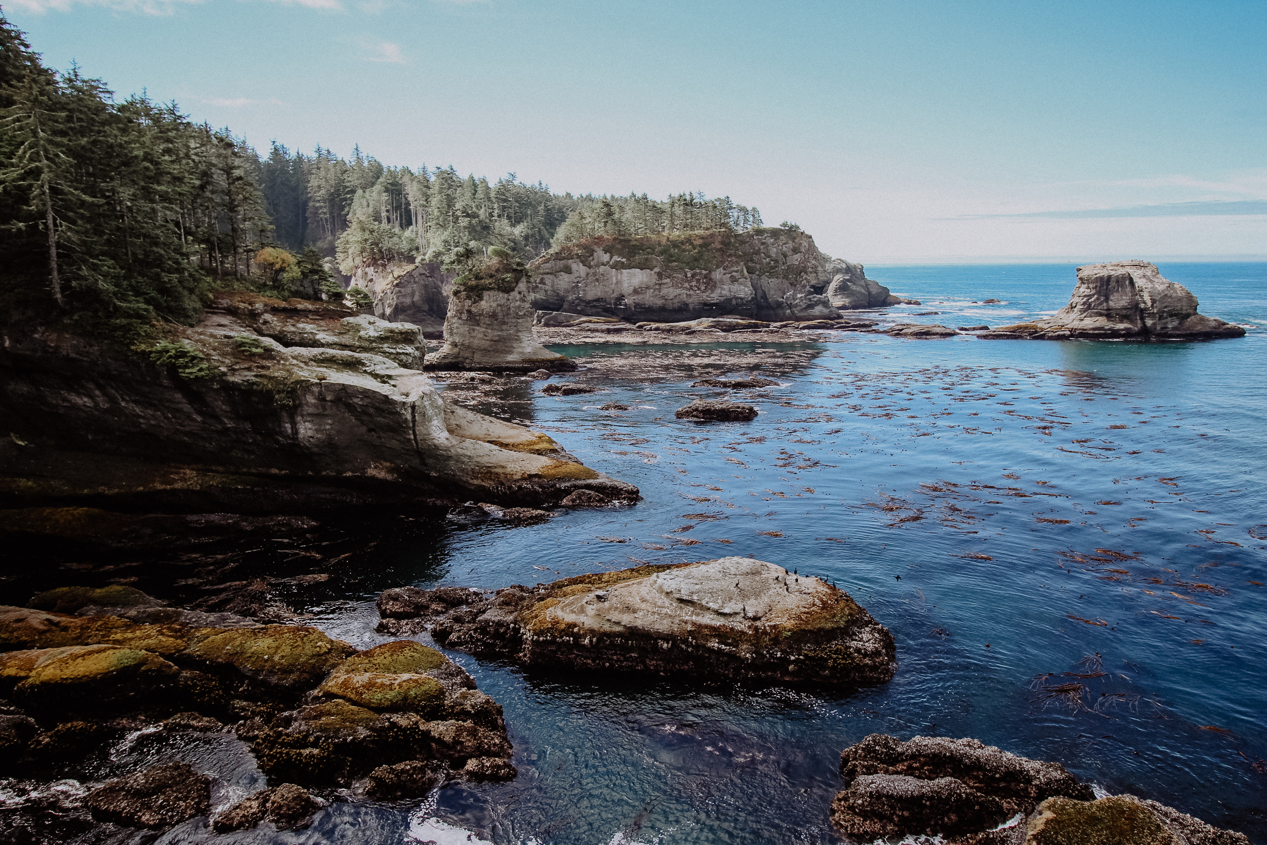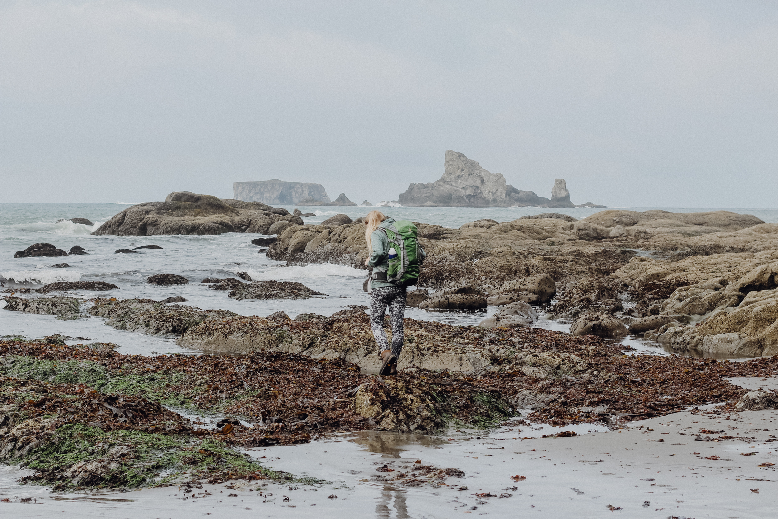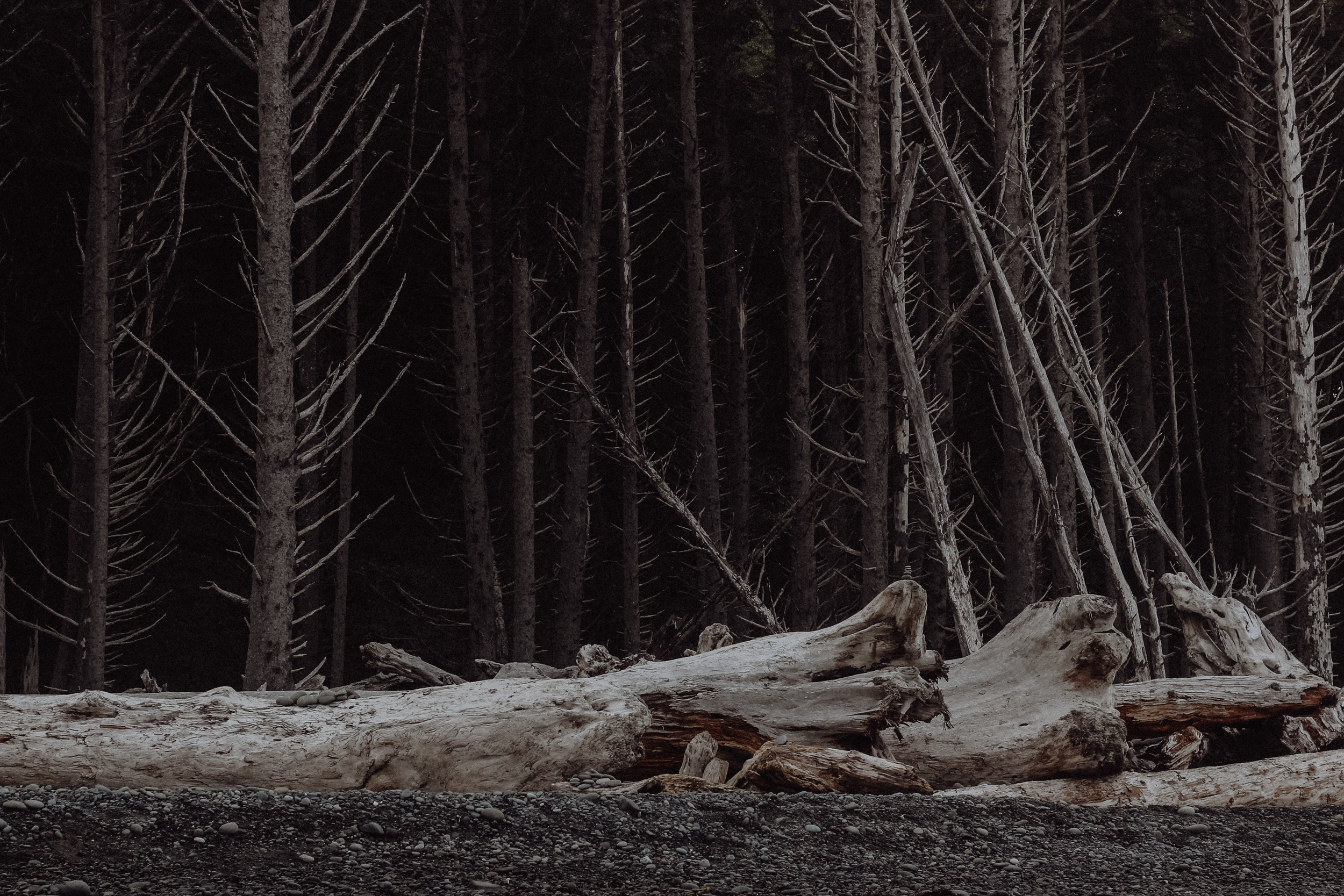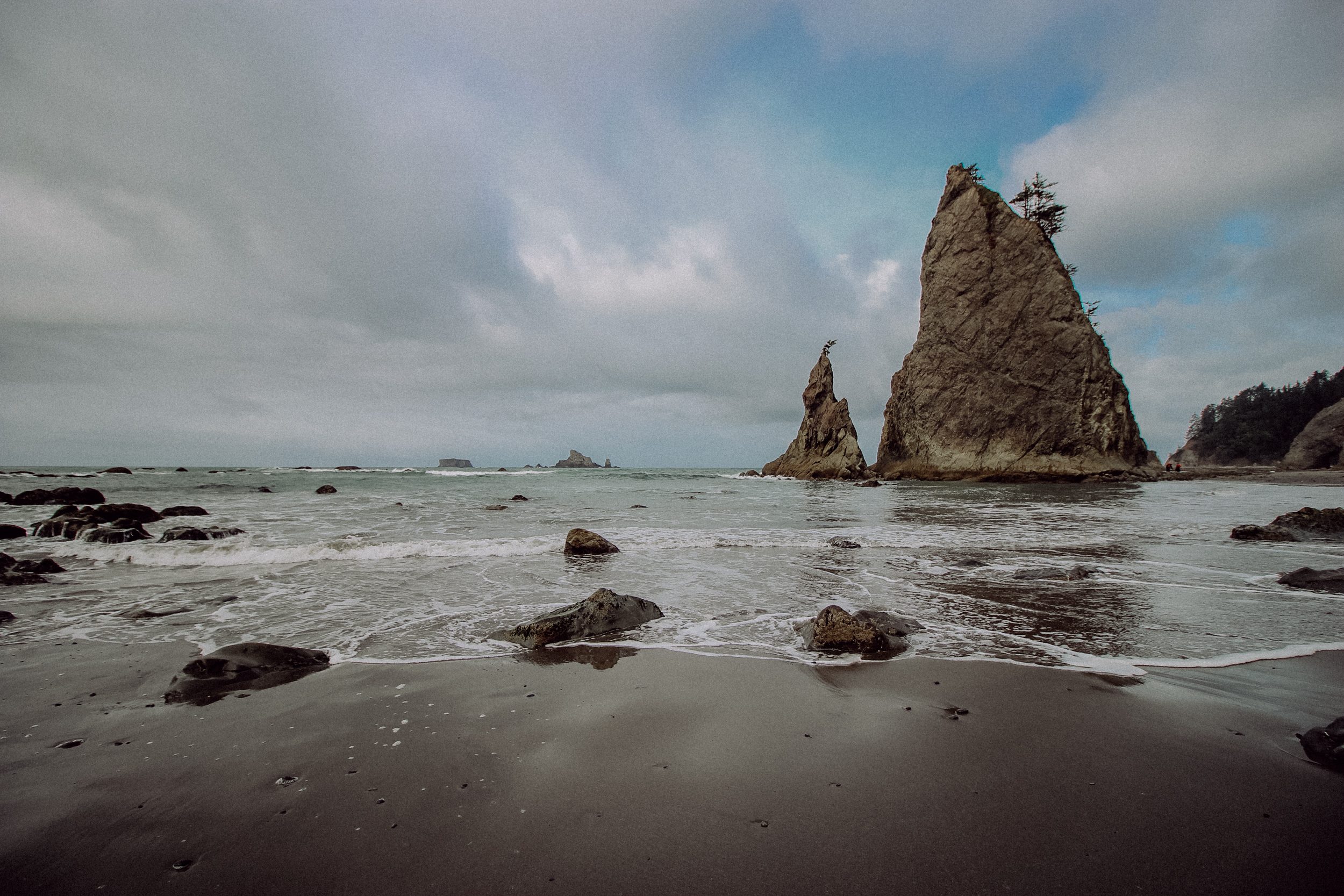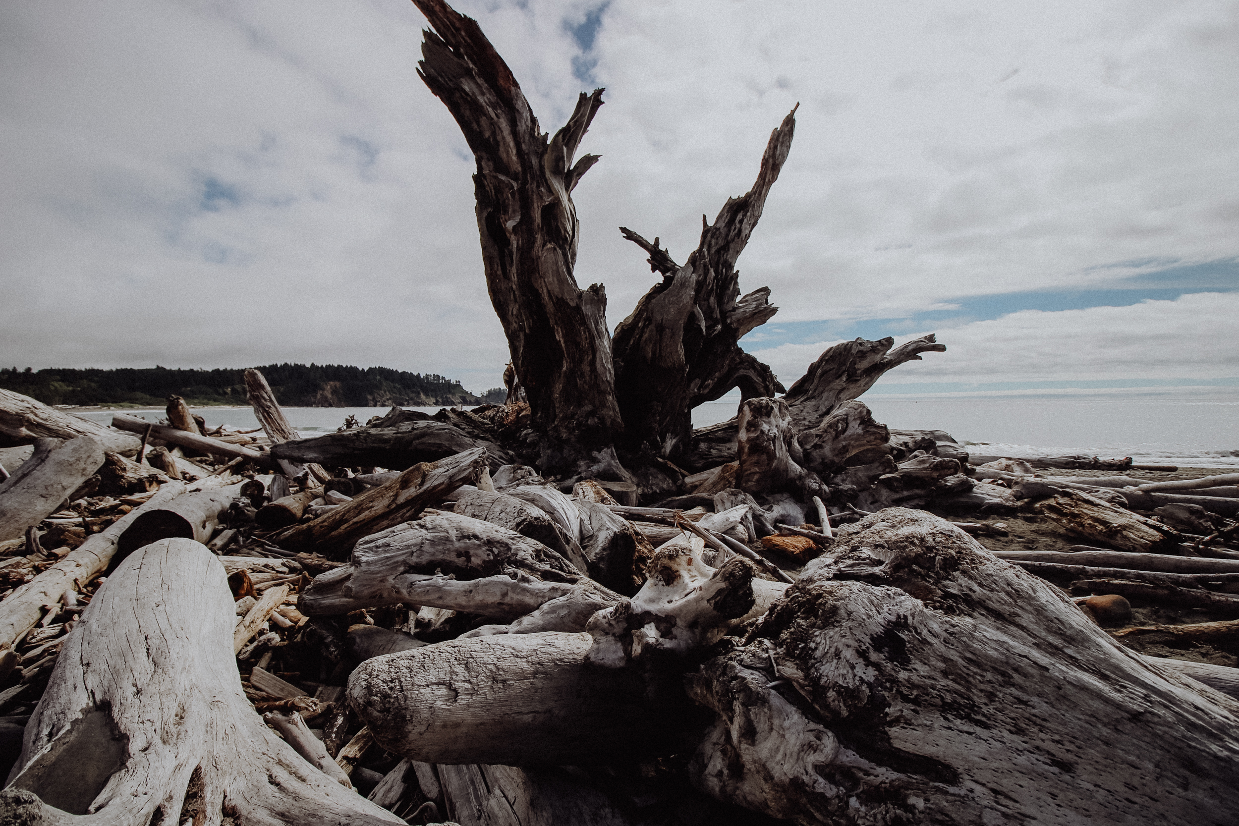 Fast gespenstisch liegt das weiß schimmernde Treibholz wie riesige Knochen vor dem dunklen Wald am Rialto Beach. Es ist zeitig am Morgen und noch immer hängen Nebelschwaden in der Ferne über dem Ufer. Die Welle kommen noch immer zu nah, also warte ich auf einem besonders hohen Baumstumpf, dass sich das Wasser noch weiter zurückzieht. Kurz vor acht scheint die Ebbe ihren Höhepunkt erreicht zu haben und ich schließe mich ein paar anderen Wanderern zu den Tide Pools an. Eine halbe Stunde laufen wir, bis wir die spitzen Felsen erreichen, die zuvor nur wie kleine Zähne aus dem Wasser zu ragen schienen.