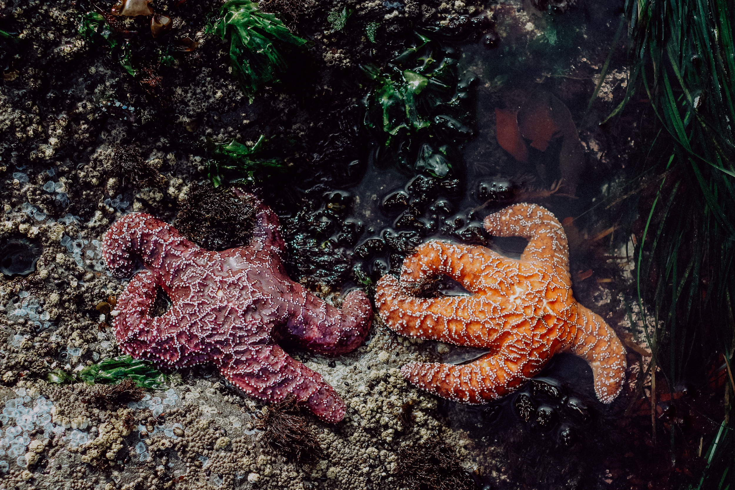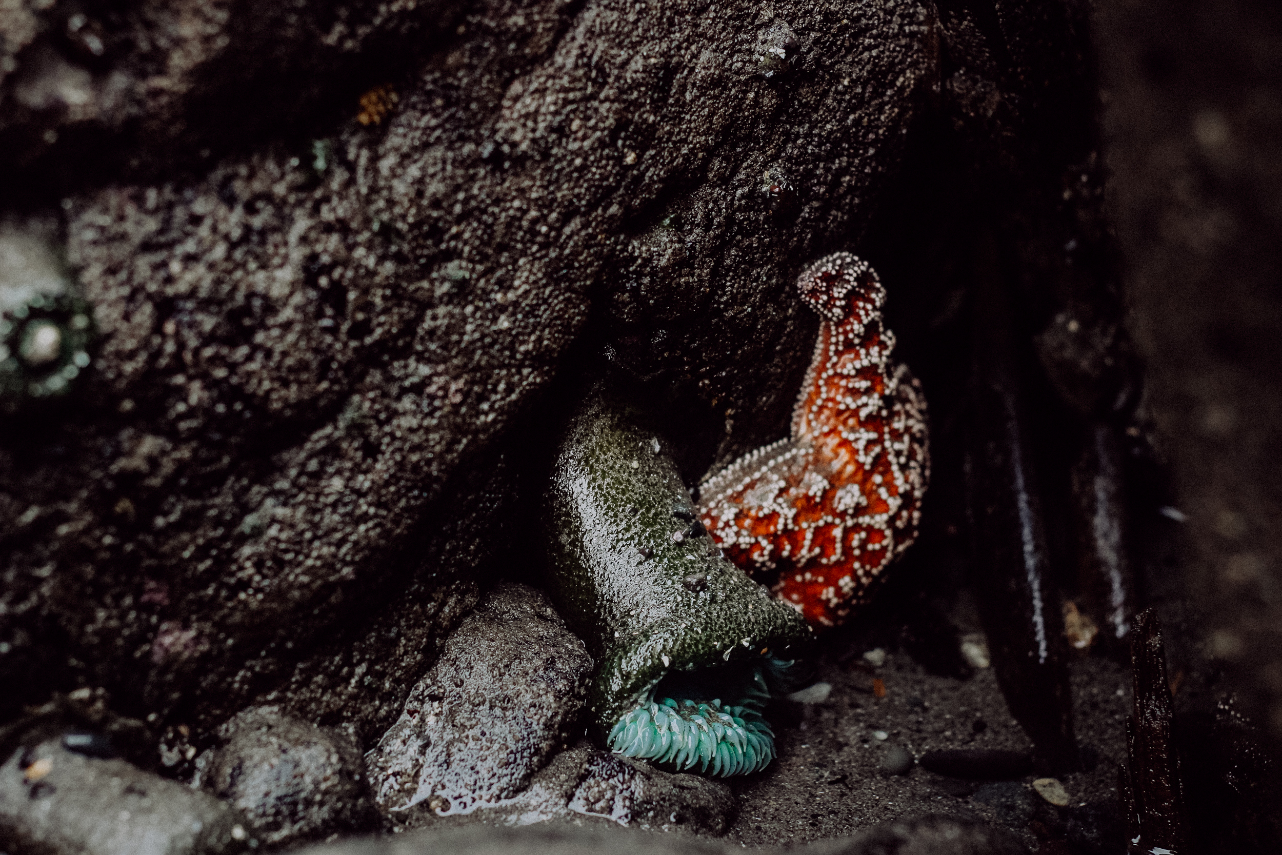 Um die Felsen herum, zwischen den Steinen, haben sich sogenannte Tide-Pools gebildet. Während der Ebbe bleiben am Ufer diese kleinen Wasserbecken zurück, in denen man wunderbar Meerespflanzen und Tiere beobachten kann, die sonst im dunklen Wasser verborgen bleiben. Ich verbringe die Zeit mit der Suche nach Krabben und Seesternen und fast hätte ich den Moment verpasst, als die Flut die Steine überspült. Auf dem Rückweg muss ich mich sehr beeilen, um rechtzeitig wieder den breiten Strand zu erreichen.