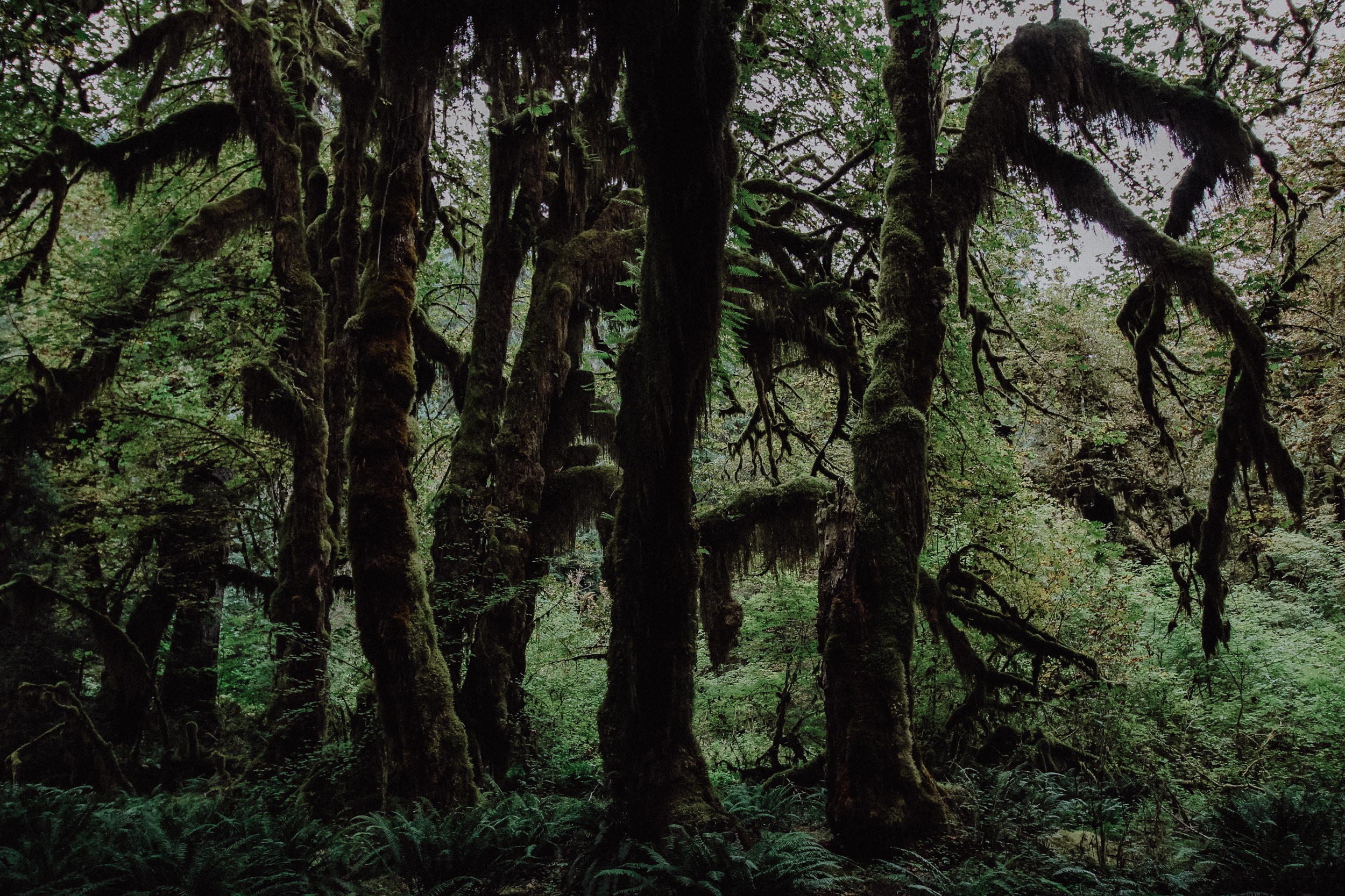 Bereits zu Beginn der Hoh River Road wechselt das Licht der feuchten Luft in ein warmes, leuchtendes grün, erzeugt von den dicht bemoosten Bäumen, die über die Straße greifen, als wollten sie jeden Eindringling mit ihren knorrigen Ästen in ihre verwunschenen Tiefen ziehen. Bis zu 430 cm Regen fällt in diesem Bereich der Olympic Peninsula jedes Jahr und erschafft so das üppige, grüne Blätterdach, unter dem die Klamotten binnen weniger Minuten nass und schwer am Körper kleben.