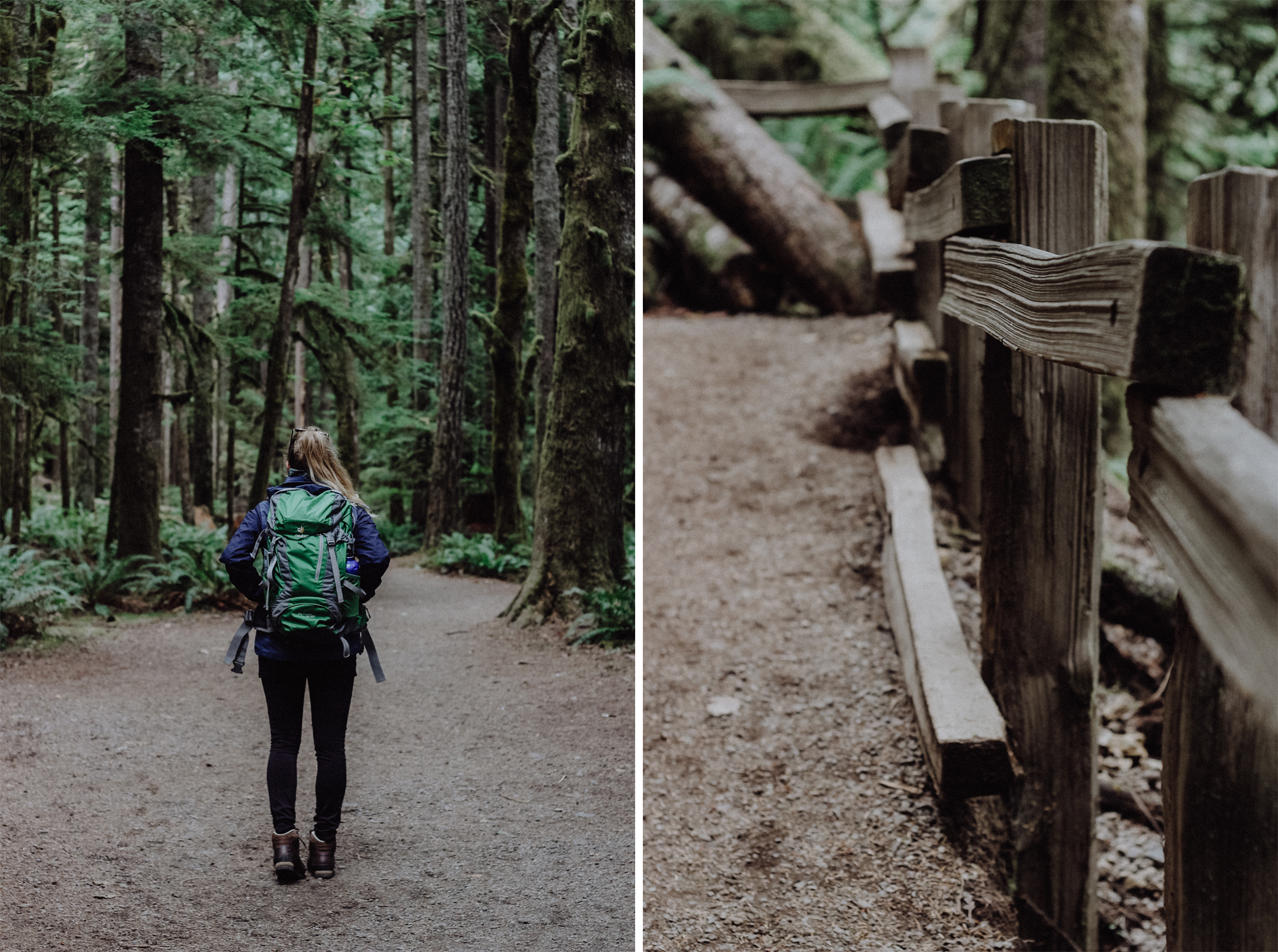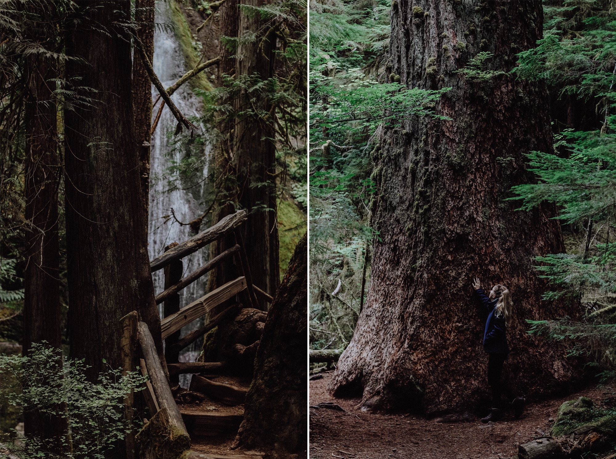 Ich ließ mein Auto unweit der Lake Crescent Lodge an der Südseite des Sees stehen und machte mich von dort auf, um auf dem kurzen Trail zu den Marymere Falls zu laufen. Obwohl der Weg aber wirklich nicht lang war, braucht ich gefühlt eine Ewigkeit, denn der Wanderweg zu den Wasserfällen glich einem gigantischen Gewölbe aus riesigen, moosüberwucherten Bäumen, sodass ich überall stehen blieb, um die mir so neuen Dimensionen zu begreifen. Wie ein Dach schlossen sich die Baumwipfel über meinem Kopf und tauchten die Luft in grünes Licht.
