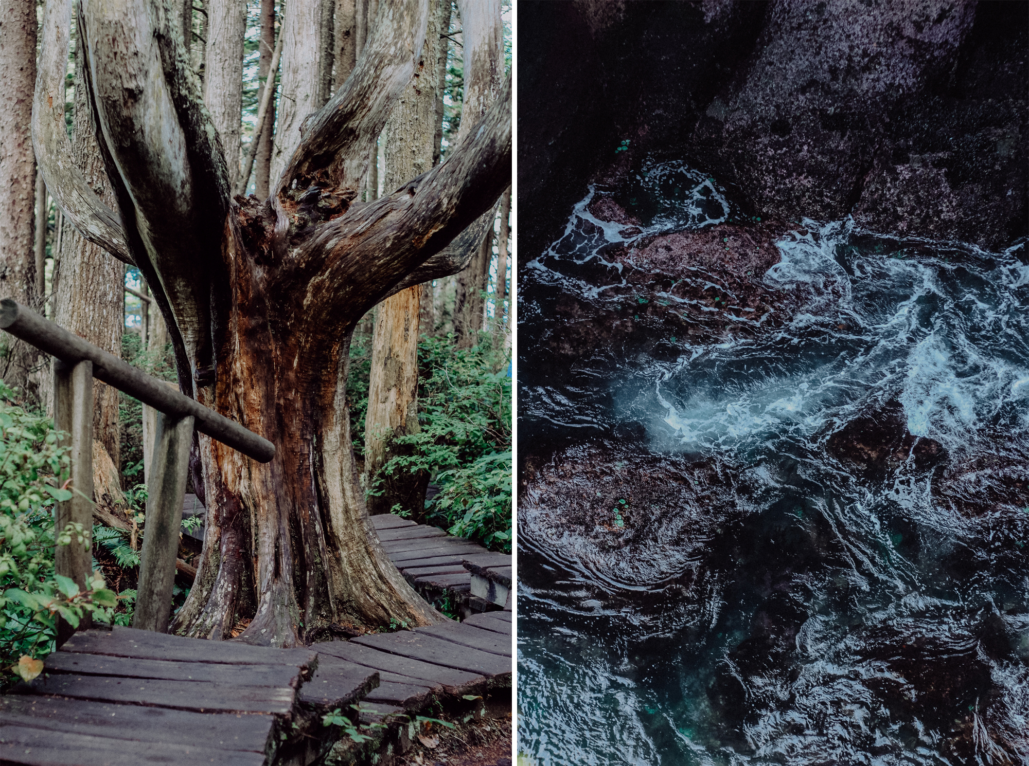 Mein Plan ging auf: Wenige Meilen vor Cape Flattery hatte ich klaren Blick auf die Küste, auch wenn in den Anhöhen noch immer dichte Nebelschwaden hingen.Ich ließ mir also noch ein bisschen Zeit, hielt an Fischräuchereien am Weg und genoss den Ausblick vom Highway 112, der Juan Fuca Scenic Route. Pünktlich zu meiner Ankunft brach auch wie erhofft die Sonne durch die Wolken, sodass ich mich in bester Laune und großer Vorfreude auf den Waldpfad zum Kap begab. Mit jedem Schritt wurden Schreie der Möwen und das Rauschen der Wellen lauter und nach wenigen Kilometern trat ich durch das Tor aus Bäumen an den Rand der Klippen. Bis zum frühen Nachmittag blieb ich hier und hielt Ausschau nach Tieren und genoss die hier so selten gesehene Sonne.