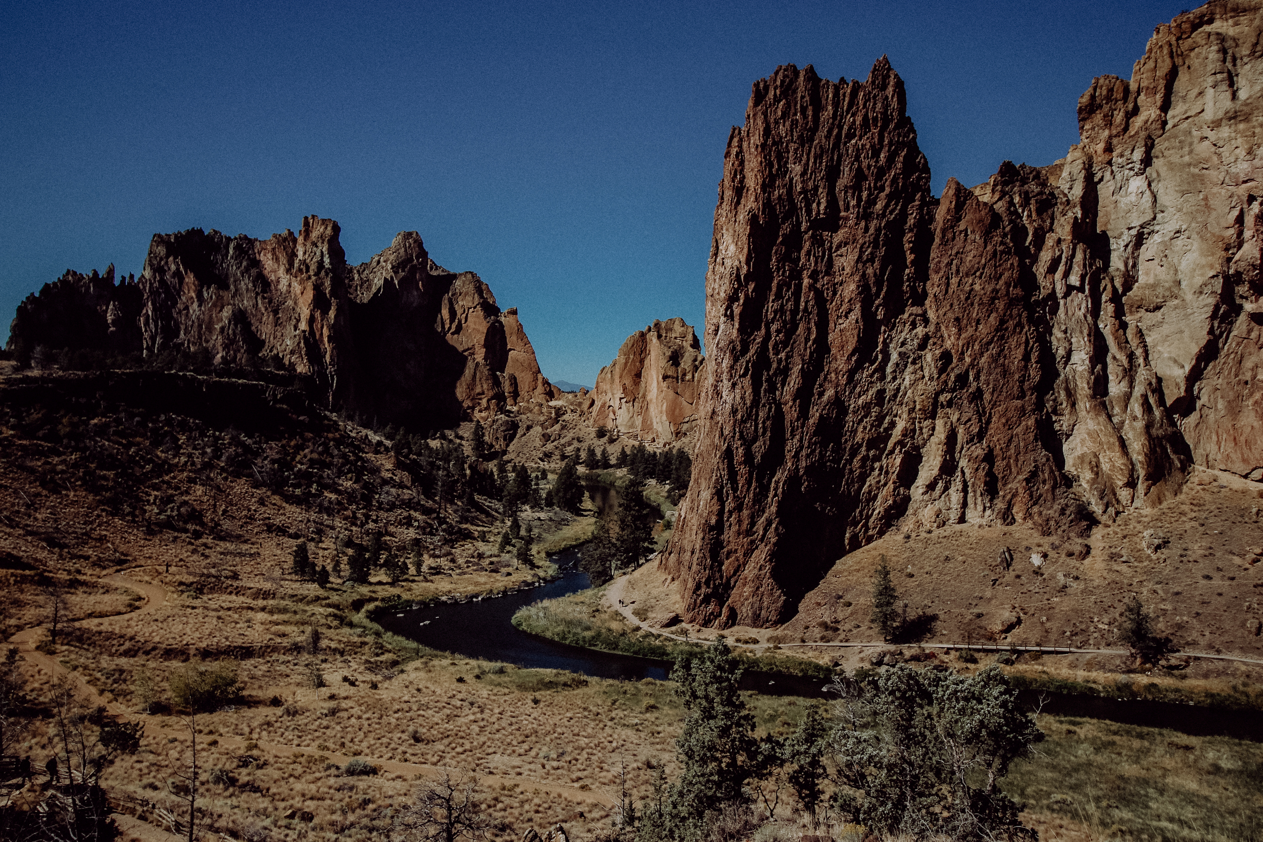 eine Nacht /// Nachdem die bisherige Szenerie des Roadtrip vor allem durch wasserreiche, dichtgewachsene Wälder und graublaukalte Küstenlandschaften geprägt war, war die Tour in den Smith Rock State Park eine echte Überraschung. Während der Fahrt von Hood River verschwanden nach und nach die hochgewachsenen Bäume und hinterließen staubig trockene Wüstenlandschaften mit dürren Sträuchern. Spätestens aber, als ich zum Smith Rock State Park einbog, fand ich mich in einer Landschaft wieder, die auch als Kulisse für den nächsten Western dienen könnte. An 300 Tagen im Jahr scheint hier die Sonne erbarmungslos ins Tal zwischen die schroffen Felsen und lässt das Wasser des Crooked River glitzern. Ein Cowboy mit Mundharmonika hätte also kaum jemanden verwundert.