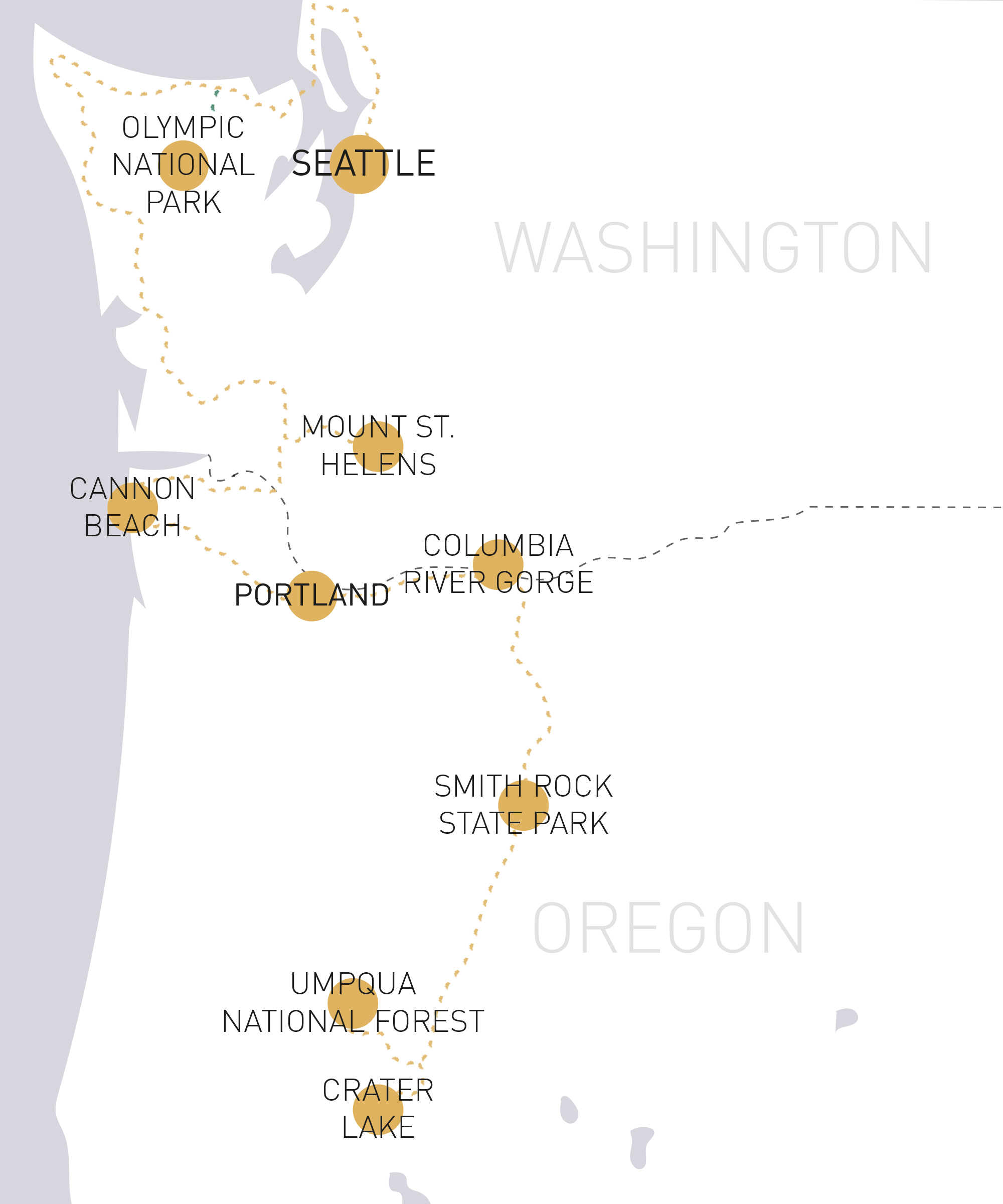 Der Pacific Northwest: Der Inbegriff eines wilden Abenteuers. Hier kann man in unberührter Natur wandern und Kajak fahren, Surfen und Reiten, Wale beobachten, Berge besteigen und durch Regenwälder streifen, Vulkane und riesig hohe Wasserfälle besichtigen, den Lachsen beim Wandern zu sehen, in heißen Quellen baden und die Abende am Lagerfeuer verbringen, bevor man müde von all den Erlebnissen ins Zelt sinkt.