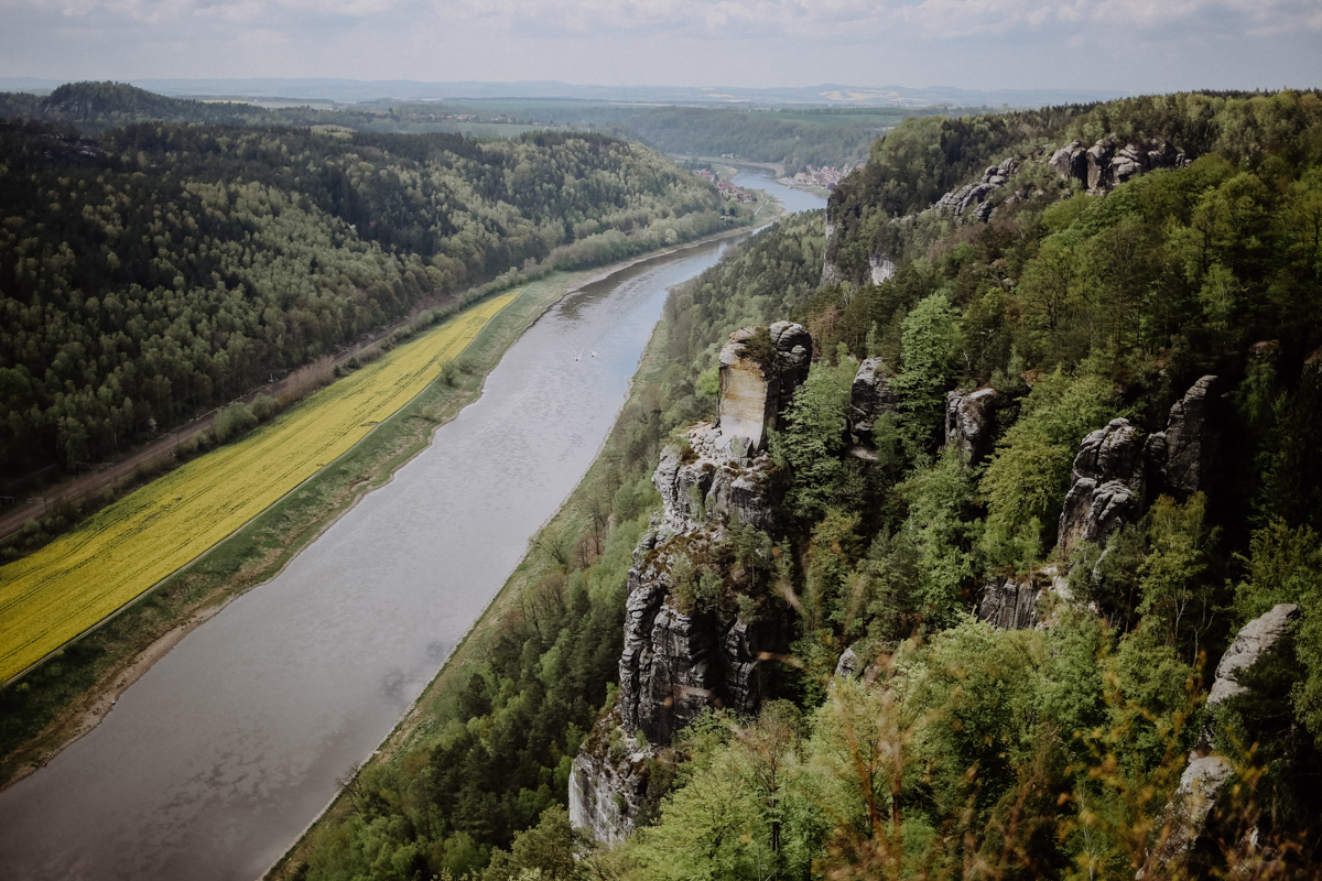 Weil die Wanderung meiner Meinung nach am schönsten ist, wenn man die Schwedenlöcher von unten nach oben durchquert, führt sie zunächst zu den Schwedenlöchern und erst im Anschluss zur Bastei. Auf diese Weise lässt man bereits einen guten Teil der anderen Wandernden zurück, da die meisten in Rathen den direkten Weg zur Bastei einschlagen.