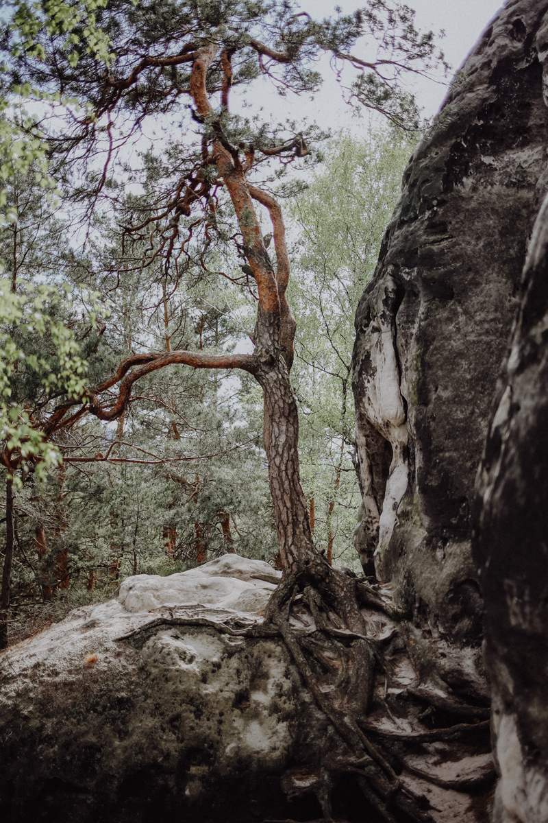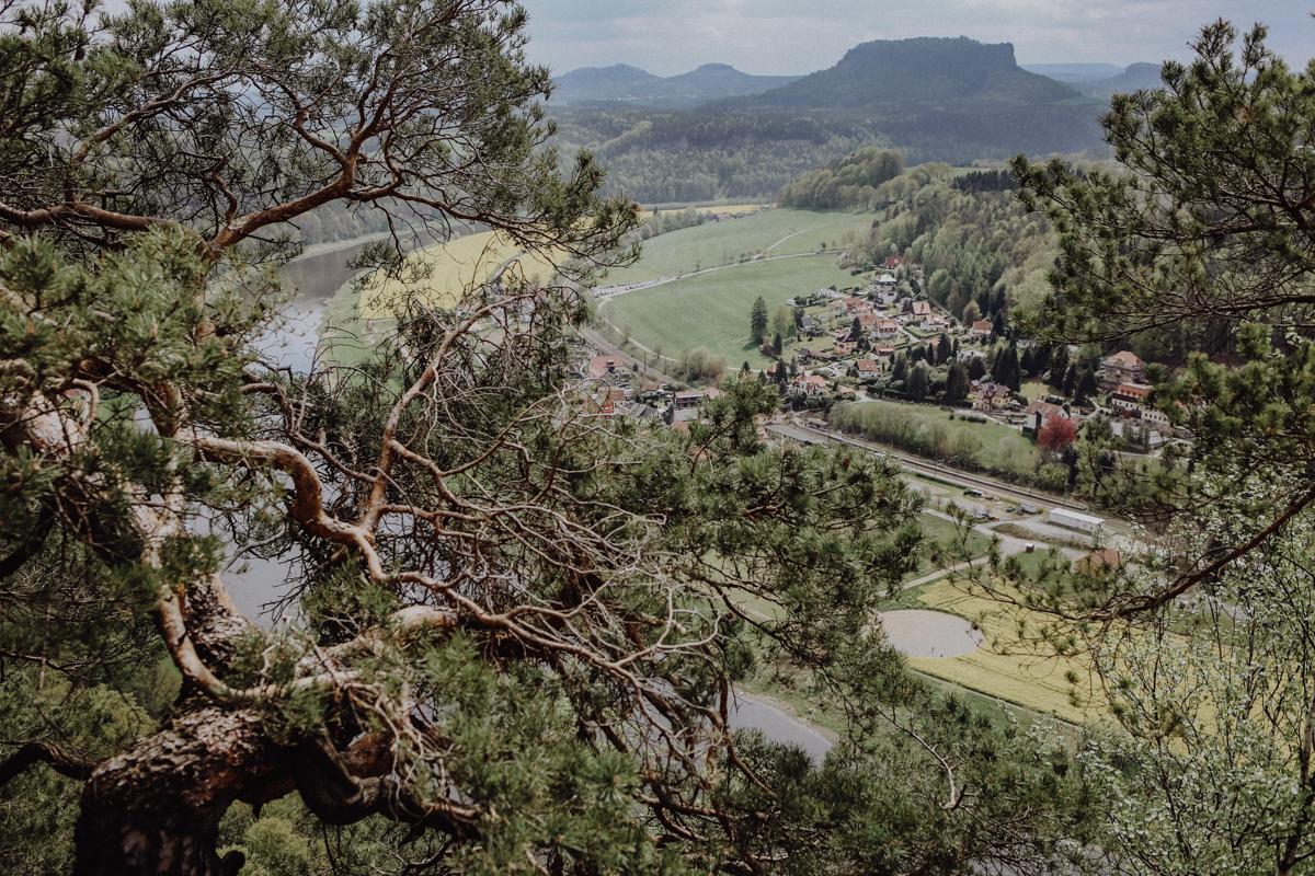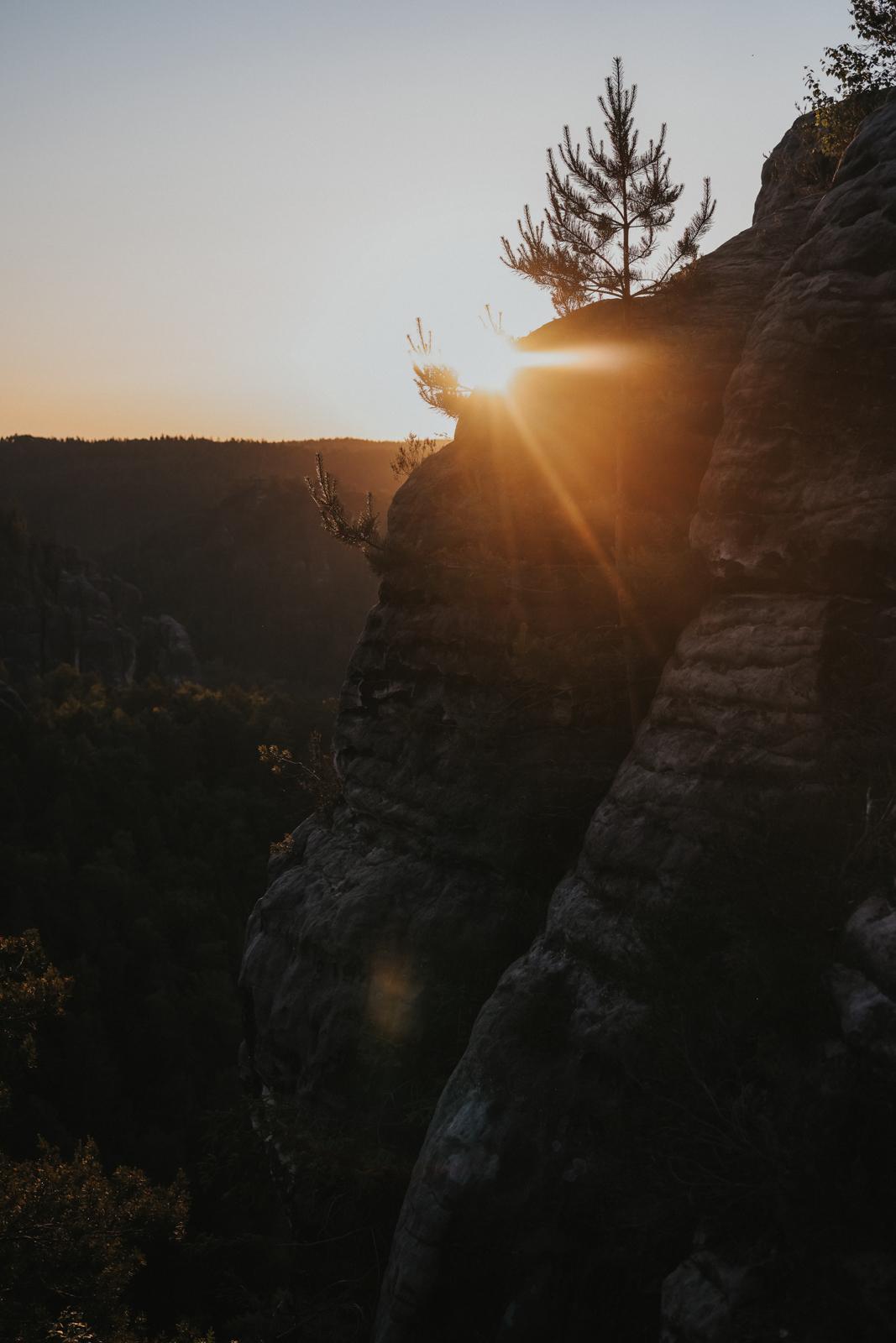… die Route von Porschdorf schließt mit dem Gamrig sogar einen weiteren beeindruckenden Felsen ein. Wenn Du ihn auf dem Hinweg vielleicht noch übersehen hast, solltest Du ihm am späten Nachmittag umso mehr Aufmerksamkeit schenken! Dann nämlich, wenn die Sonne sich so langsam gegen Abend neigt, taucht sie die Südseite des Felsens Picknickplätzen in ihr goldenes Licht. Dann gilt es nur noch, unter den vielen knorrigen Kiefern den Lieblingsplatz zu finden…
