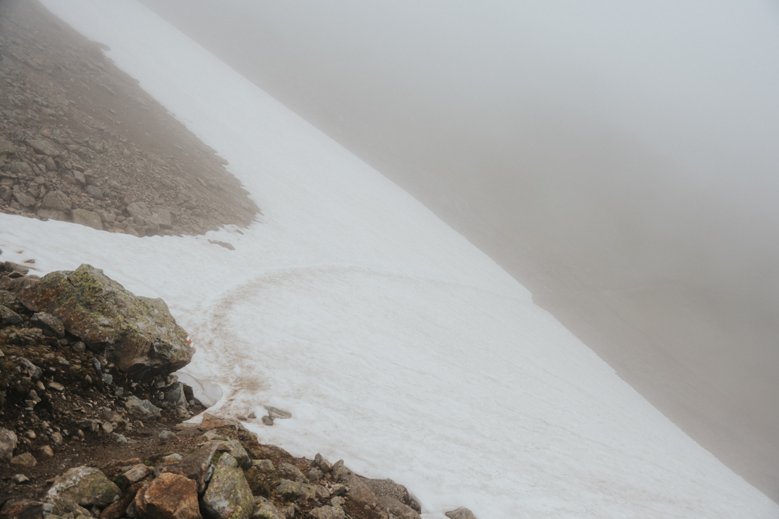 Pustekuchen! Das Joch hatte ich zwar unkompliziert nach einer Stunde erreicht, doch die Wolken schienen sich keinen Zentimeter bewegt zu haben. Weil der Gratweg hinüber zum Sankt Antönier Joch bei solchem Wetter doch zu gefährlich wäre, entschloss ich mich stattdessen schweren Herzens für den Abstieg und rettete mich mit dem Gedanken an den Gandasee, einen kleinen Bergsee unterhalb der Gargellenköpfe.