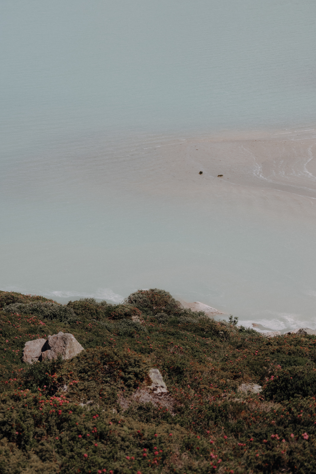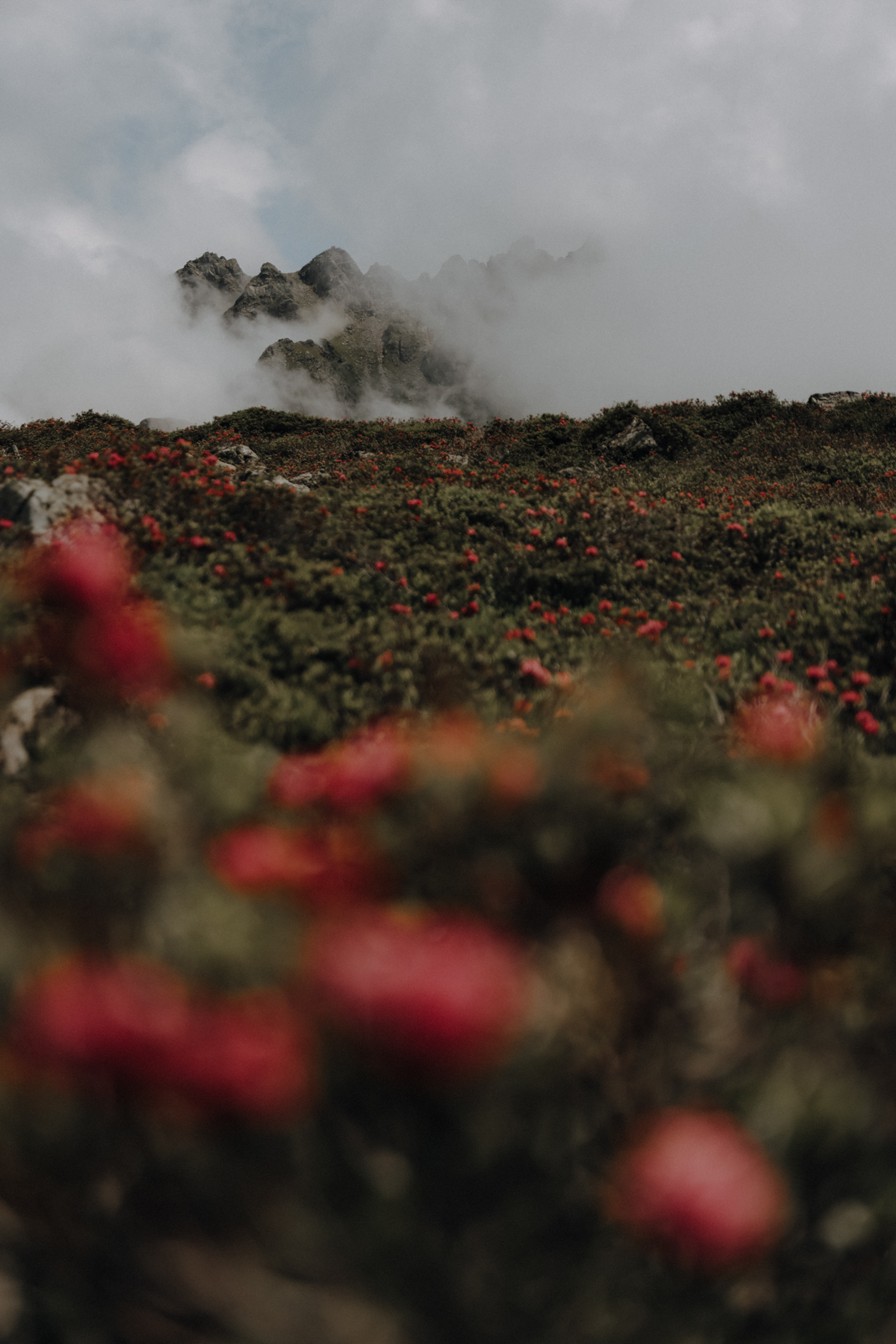 Und tatsächlich! Als ich den See erreichte, waren mir immerhin 5 Minuten vergönnt, in denen ein Windstoß die Wolken zerstreute und ich einen kurzen Augenblick lang den Anblick des blau schimmernden Wassers inmitten von Alpenrosen und den dahinter liegenden Gipfeln genießen konnte.
