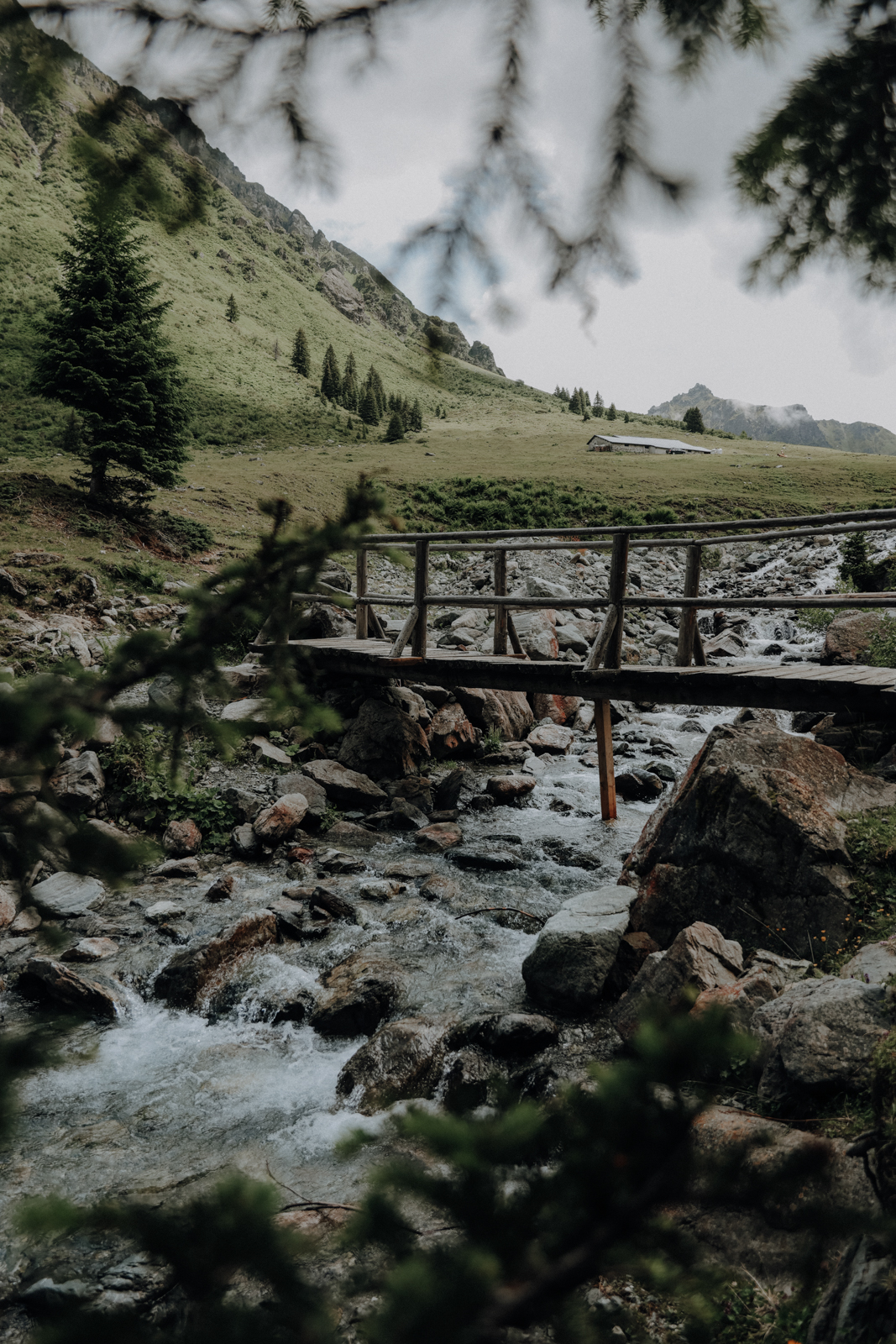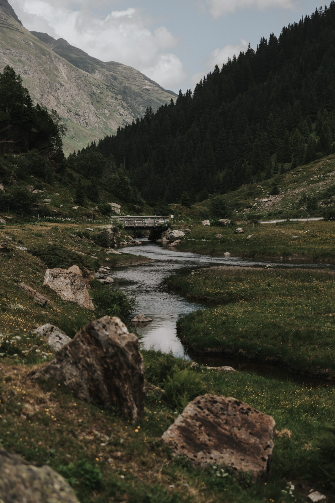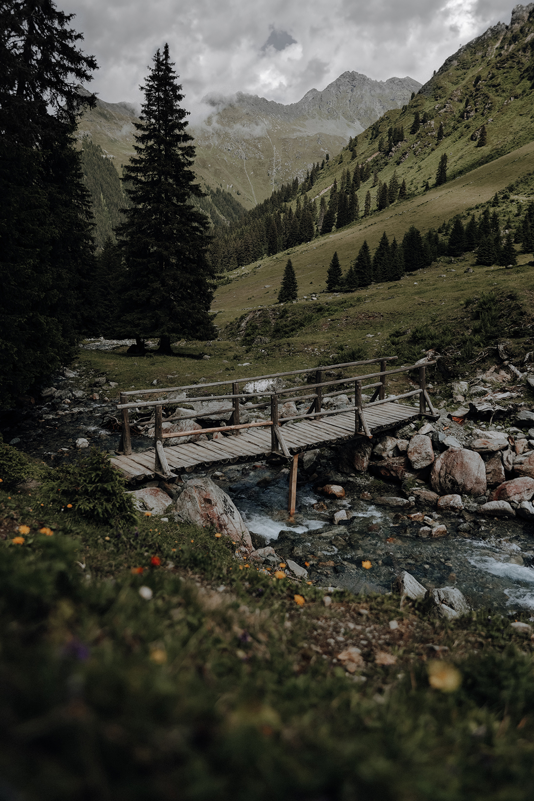 Weil die Gratwanderung sehr viel länger gedauert hätte als der kurze Abstecher zum See, hatte ich nun immerhin genügend Zeit für den Abstieg zur Talstation und wurde von dieser Idee zum Glück nicht enttäuscht. Im Gegenteil! Schon nach wenigen Minuten verließ ich die Forststraße und folgte einem schmalen Singletrail zunächst an der Obwaldhütte vorbei immer weiter hinab zum Valzifenbach ins gleichnamige Tal und konnte mein Glück kaum fassen über das, was ich dort fand! Wild sprudelnd sucht sich der Valzifenbach seinen Weg zwischen grünen Wiesen und kleinen Nadelwäldern, bildet hier und da Wasserbecken, so tief, dass man darin baden kann und wird mehrfach malerisch von Holzbrücken überspannt!