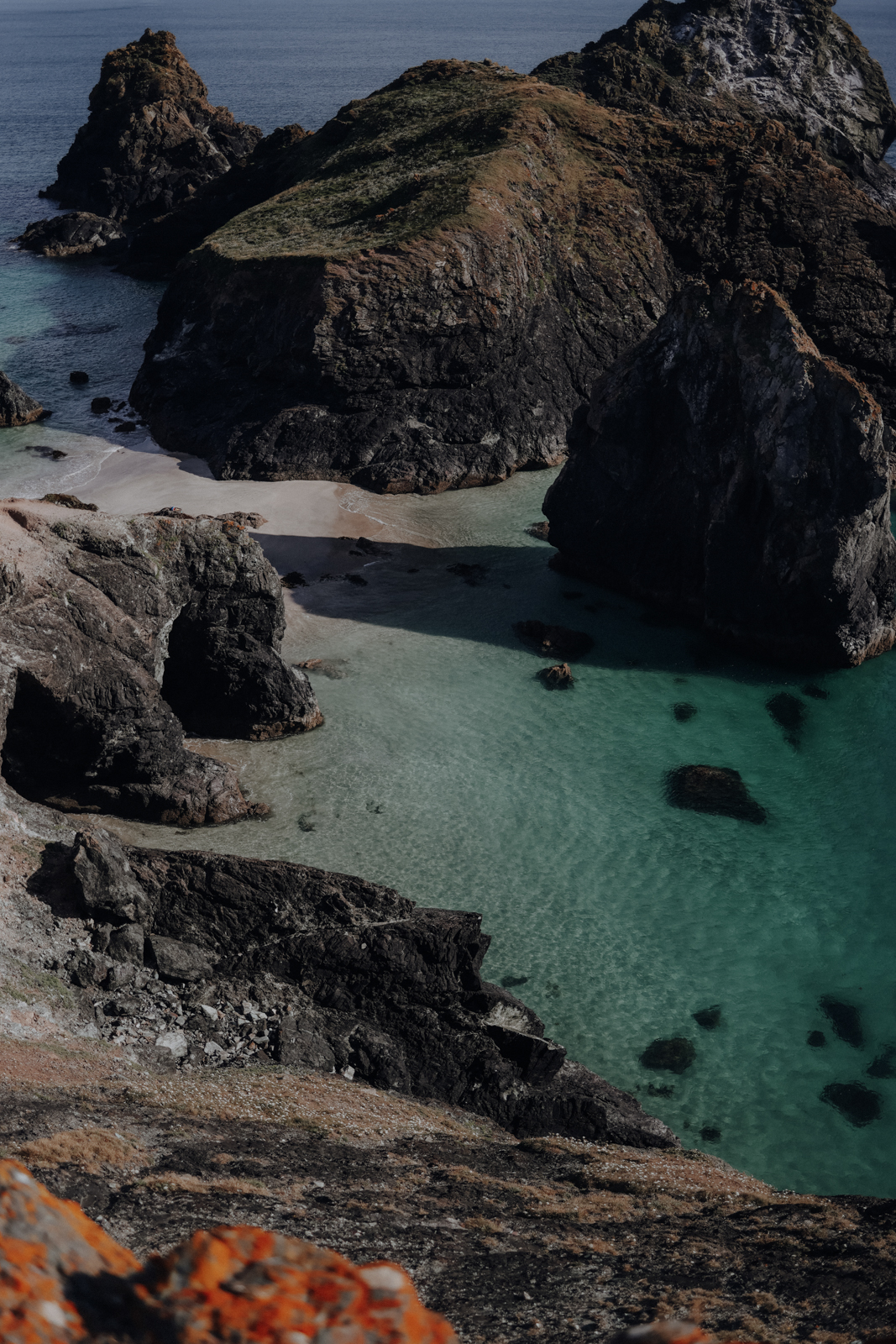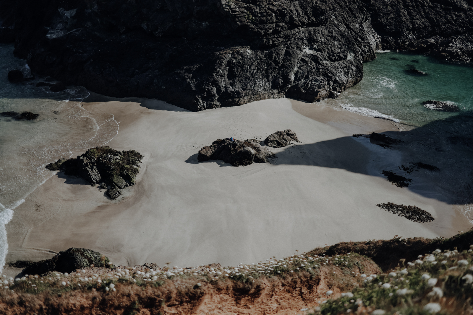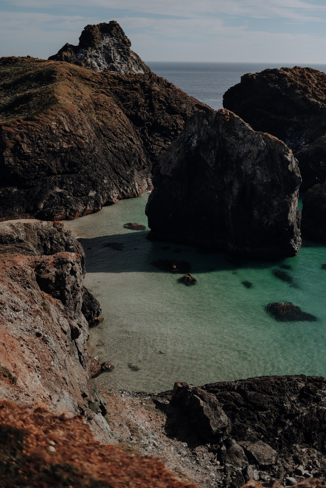 Erst kurz vor der Kynance Cove ändert sich die Landschaft: Wie eine Piratenbucht ragen Felsen und Höhlen vor weißen Stränden auf, türkisblaues Wasser überspült Grotten und Sandbänke. Niemanden  würde es wundern, Captain Jack Sparrow mit einer Flasche Rum dort stehen zu sehen. Einziges Manko: Die Kynance Cove ist unglaublich beliebt - vor allem bei Ebbe und dank eines nahegelegenen Parkplatzes auch so leicht zugänglich, dass am Wochenende unter all den Sonnenstühlen und Handtüchern nicht mehr viel von der Landschaft zu erkennen ist. Weil der Ort sonst aber so magisch ist, lohnt es sich wirklich sehr, die Wanderung so anzupassen, dass man ihn nicht gerade am Wochenende und erst kurz vor Sonnenuntergang erreicht.