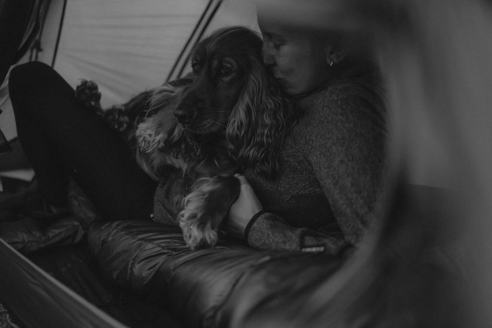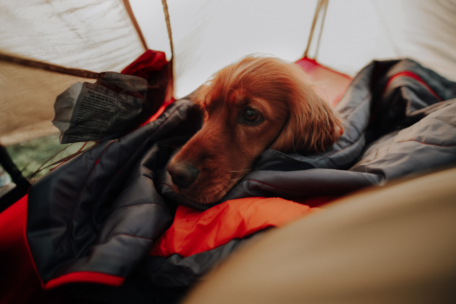 Weil Timber keine Schlafsäcke mag und nicht gern zugedeckt wird, habe ich für ihn ein dickes Outdoor-Hundekissen und ein Fleeceshirt, das ich ihm nachts zum Schlafen anziehe. Leichter wäre natürlich ein Schlafsack oder eine gekürzte Isomatte.