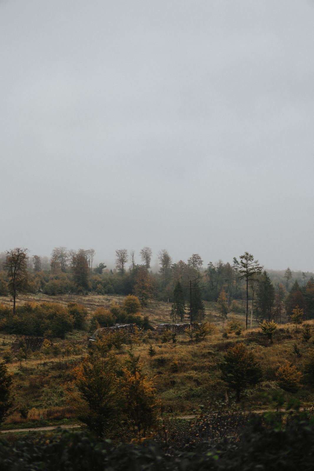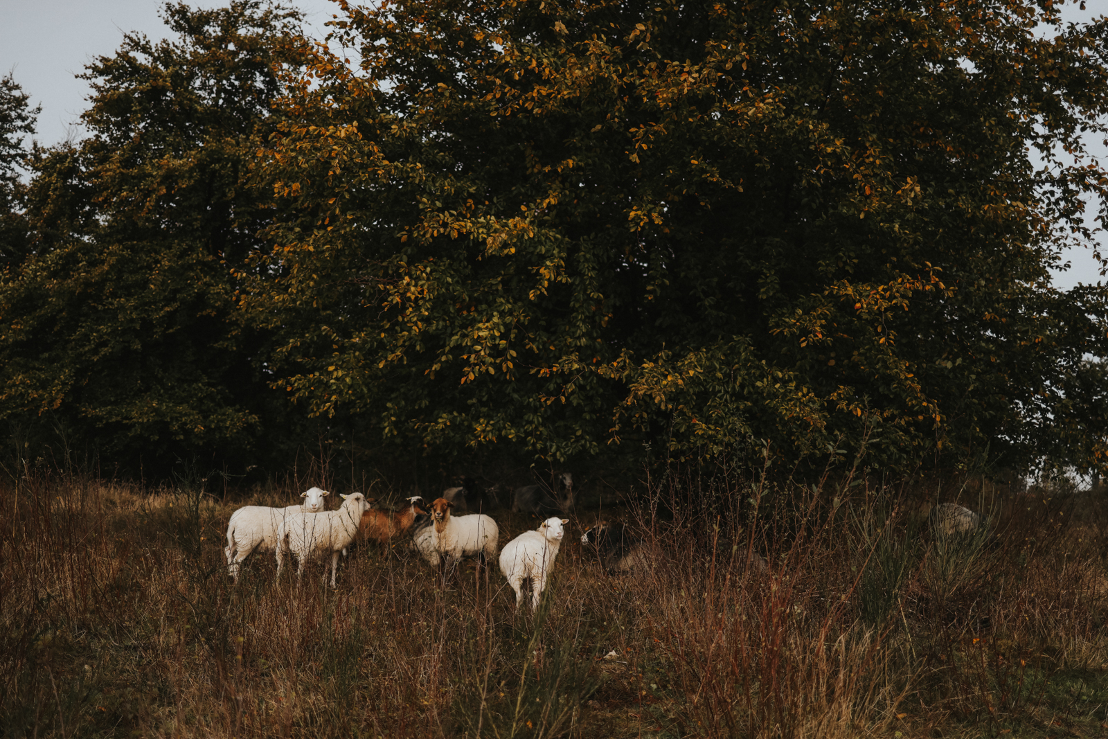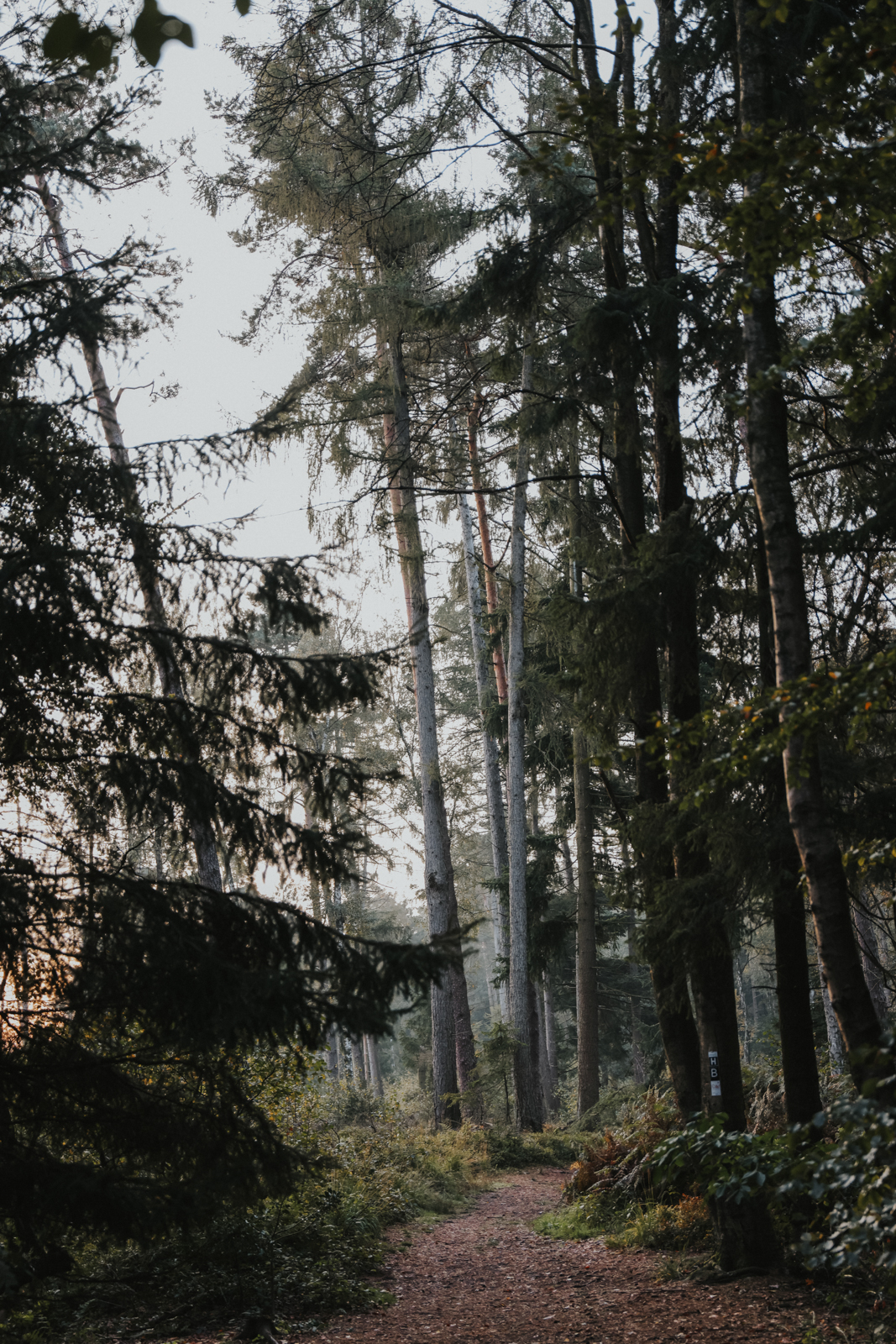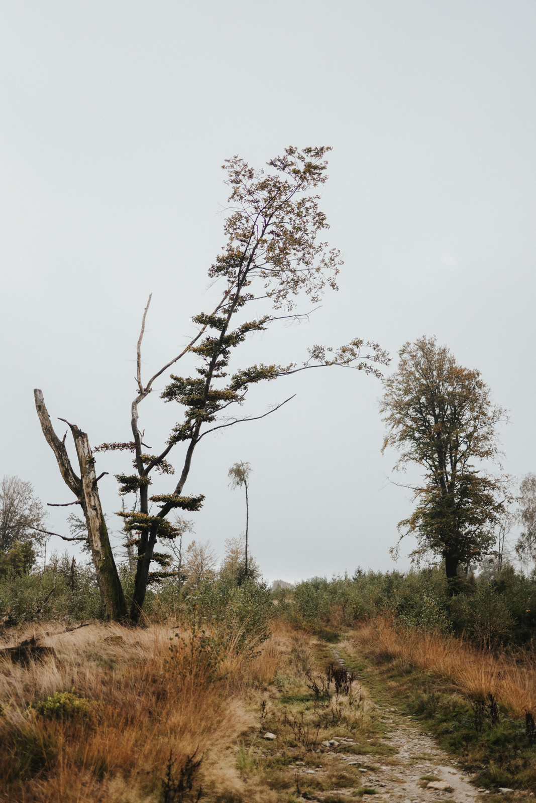 Hinter Wald-Herbram aber erreicht man wieder den grasbewachsenen Kammweg, der zwischen gelb gefärbten Gräsern, Heide und frisch gepflanzten Bäumen immerzu durch die warme Herbstsonne führt. Vereinzelte abgestorbene Baumgruppen zauberten im Nebel, der hier und da noch an den Erhebungen hing, eine schaurig-schöne Atmosphäre, wie ich sie im Herbst, mit Gedanken ans nahende Halloween besonders gern mag.