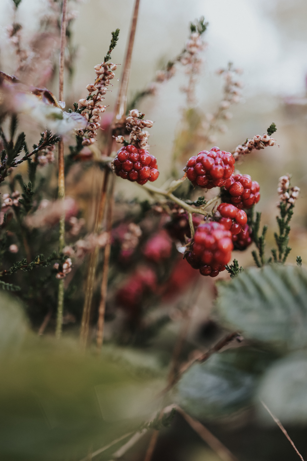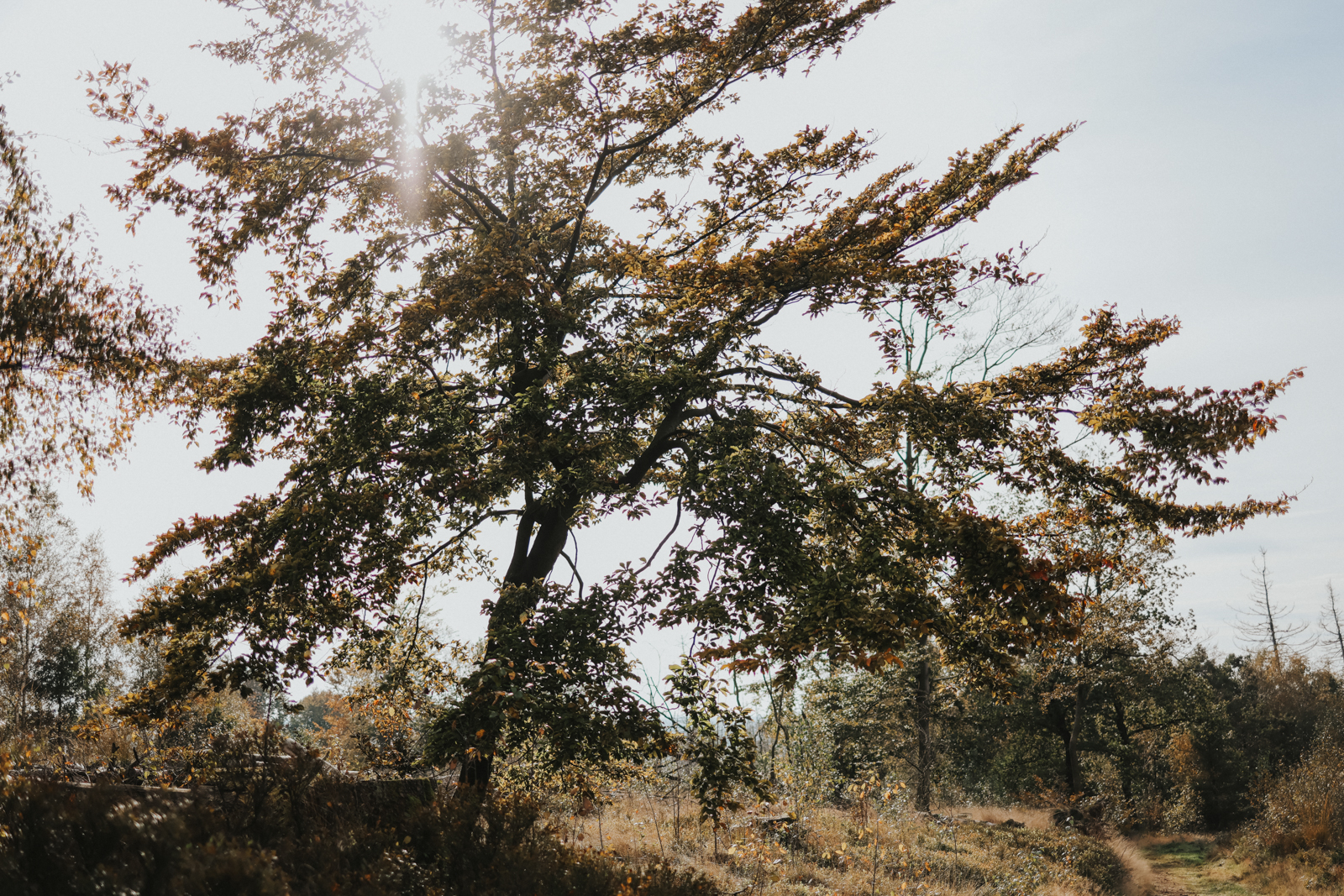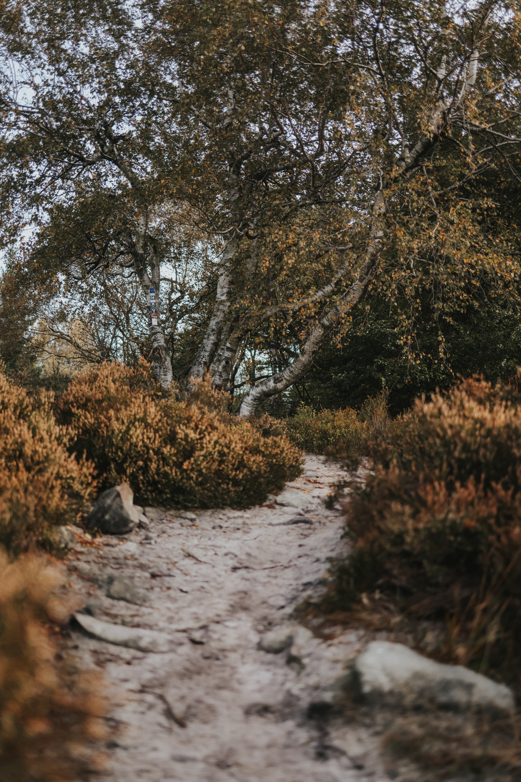 Meinen persönlichen Herzensort dieser Wanderung sollte ich nach einem steilen Anstieg finden, der mich hoch übers Silbertal brachte: Denn hier, im Bereich des Lippischen Velmerstot fand ich eine Landschaft, wie ich sie ganz besonders mag: Lilafarbene Heidesträucher nebst knorrigen Birkenbäumen und leuchtend roten Brombeeren, dazwischen sandige Wege, die sich wie helle Bänder durch das Gelände schlängeln. Und was für ein Glück ich hatte, dass ich diese höchste Erhebung des Eggegebirges genau dann erreichte, als die Sonne hinter dem Berg hervorkam und die Landschaft in goldenes Licht tauchte!