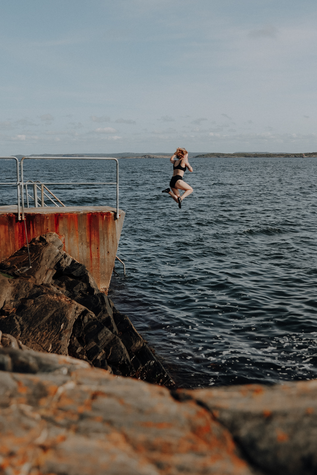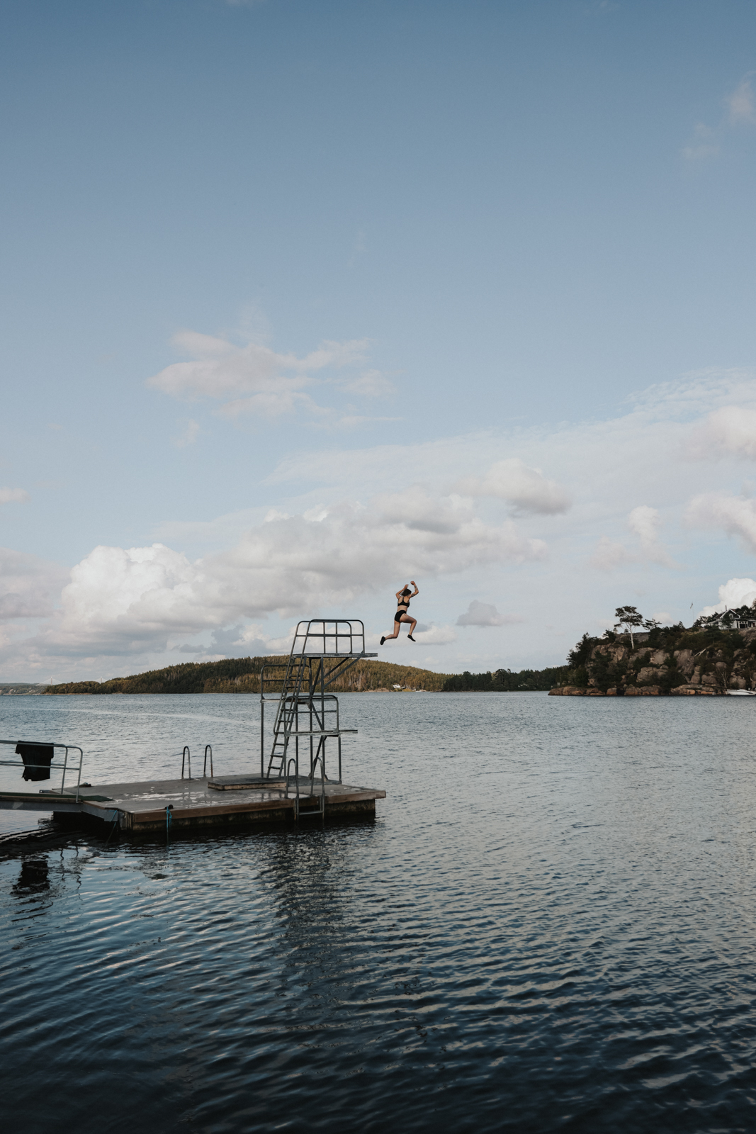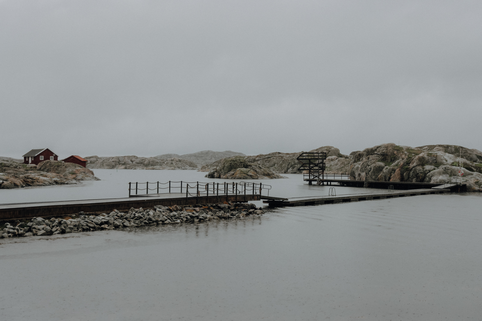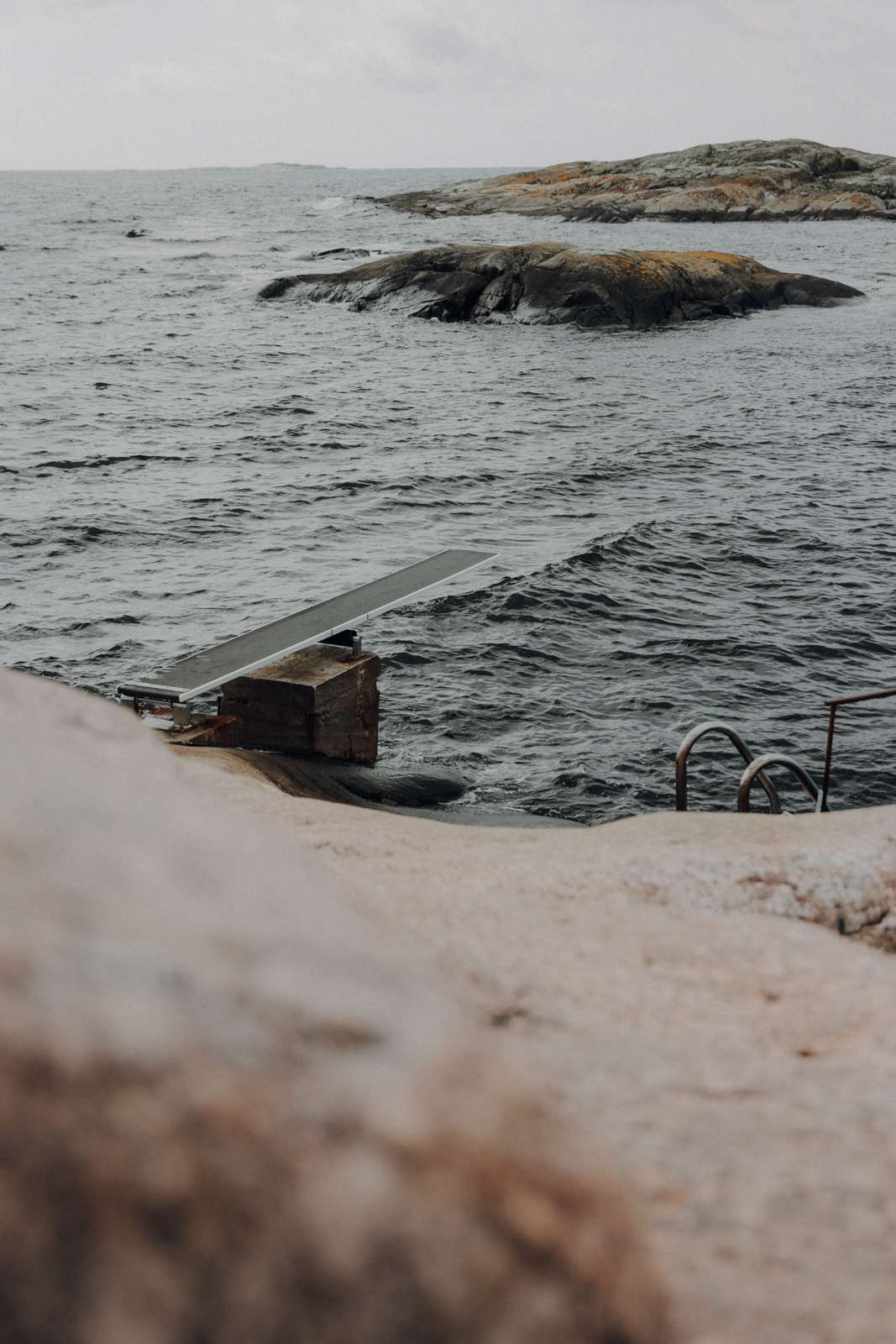 Natürlich gibt es auch auf Orust und Tjörn unzählige Badestege - einer malerischer gelegen als der andere. Aus irgendeinem Grund war es aber der Badplats Slussen, in den ich mich so sehr verliebt habe, dass ich ihn hier vorstellen möchte: Gelegen vor dem winzigen Hafen im noch winzigeren Ort Slussen, springt man hier mit Blick auf die gegenüberliegenden Klippen vom Sprungturm oder lässt gemütlich am Steg die Beine baumeln. Gleich daneben befindet sich übrigens direkt am Wasser auch Slussens Pensionat, wo freitags und samstags kleine Bands und Singer-Songwriter auftreten.