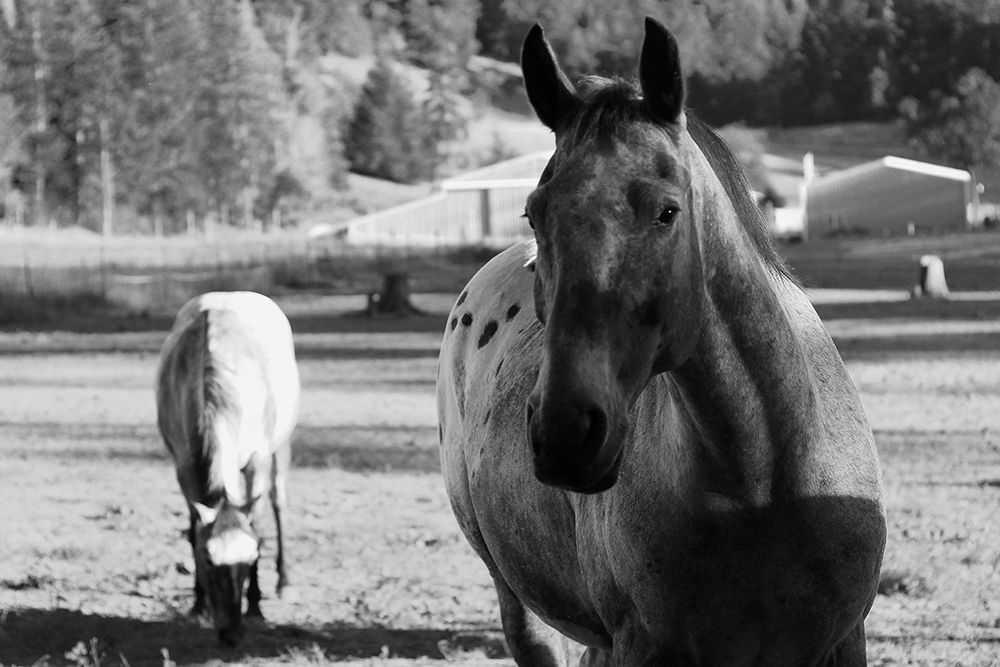 Aus den Staubschwaden tauchen langsam die Umrisse der Ranch am Fuße des Berges auf. Hellblau schimmern die Metalldächer der Ställe, eine Herde Quarter Horses döst im Schatten. Da wir viel zu früh dran sind, steige ich aus und mache ein paar Fotos von der Szenerie. Wie ich später herausfinde, mache ich am Zaun gerade Bekanntschaft mit Jack Jack, meinem Trail-Horse.