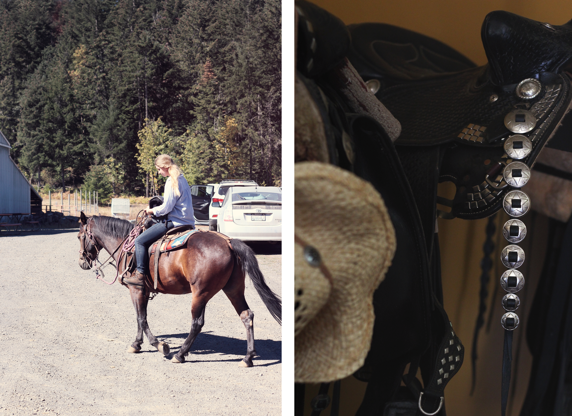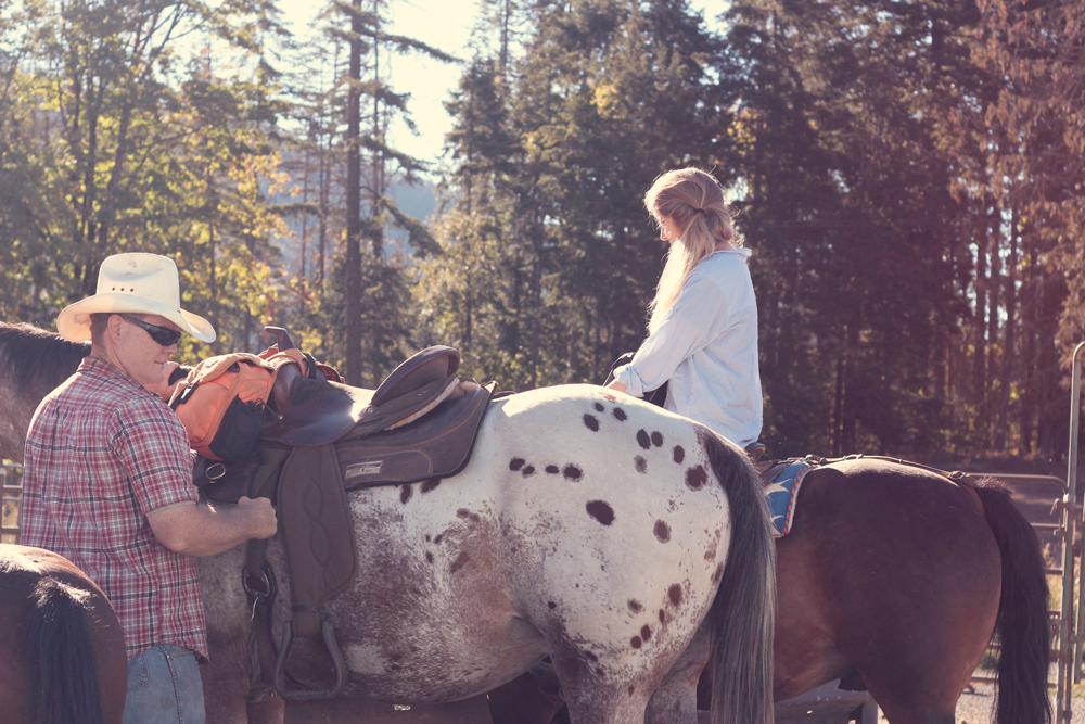 Nachdem wir das Auto auf dem großen Areal geparkt haben, frühstücken wir und beobachten die Pferde. Kurze Zeit später erscheint Cindy, die Frau des Ranchers. Gemeinsam warten wir auf ein Pärchen, das sich auch für den Trail-Ride angemeldet hat. Als die beiden eingetroffen sind, erzählt sie liebevoll über die Eigenschaften unserer Trail-Horses. Da wir alle unterschiedliche Erfahrungen haben (Michael ist beispielsweise noch nie geritten und ich viele Jahre im englischen Reitstil), erklärt Cindy mit aller Geduld die grundlegenden Eigenschaften von Pferden und wie wir – als Reiter – respektvoll und bestimmt mit ihnen umgehen.