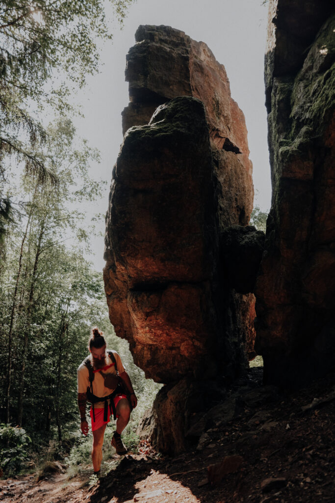 Noch auf dem ersten Kilometer wirst Du so die erste imposante Felsformation erreichen - den Teufelsfelsen. Glitzernd und funkelnd liegt das Quarzitgestein in der Sonne, sodass es gar nicht schwer ist, an das Märchen zu glauben, das man nebenan über den Teufel und die listige Magd lesen kann.