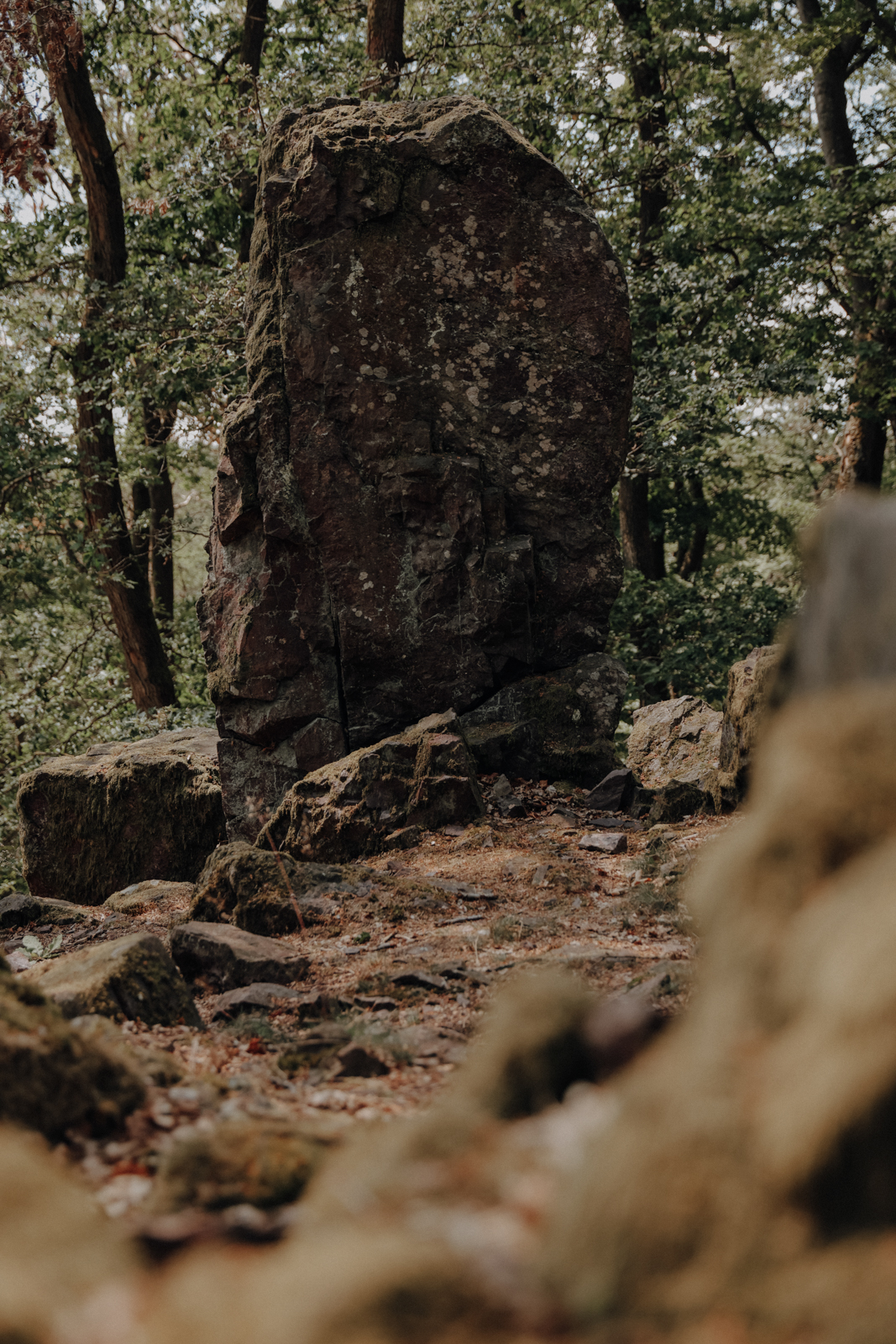Es folgt eine dritte und letzte Bachquerung, bevor man über den Bärenfelsen zu einer besonders auffälligen Steingruppe gelangt, wie man sie sonst wahrscheinlich nur aus Dokumentationen kennt. Tatsächlich geht man davon aus, dass es sich bei dieser offenkundig unnatürlichen Ansammlung von Steinen um eine uralte keltische Kultstätte handelt, wobei eine sogenannte “Blutrinne” sogar die Vermutung nahelegt, dass hier vor Jahrhunderten einst Menschenopfer dargebracht wurden.