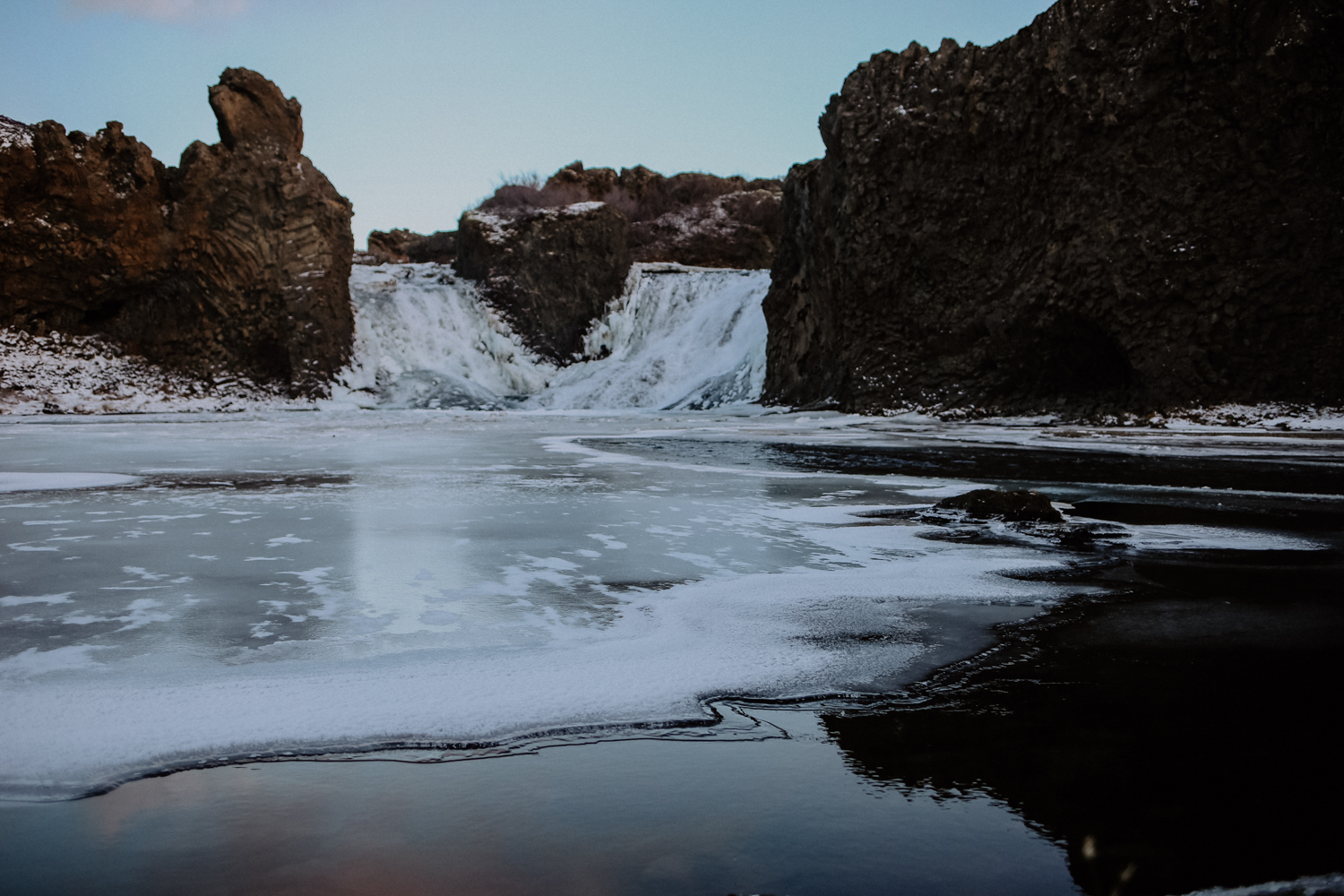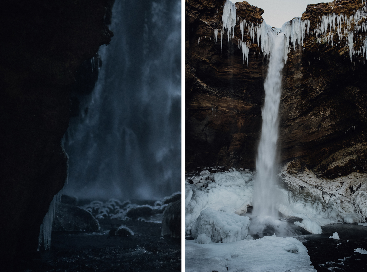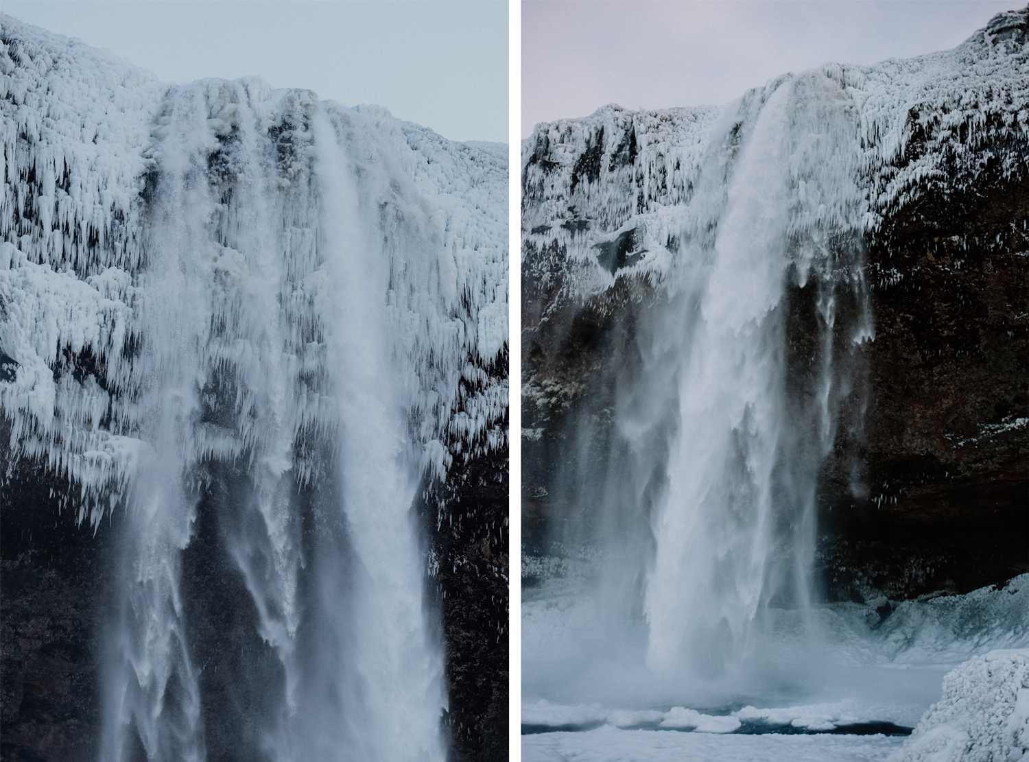 Nachdem sich die dichten Schneewolken über Nacht verzogen hatten, starteten wir am nächsten Tag bei eisblaurosafarbenem Himmel und Eiseskälte, um noch mehr Wasserfälle zu entdecken – denn Wasserfälle in Island (Du kennst bestimmt ein paar Bilder), sind so einzigartig, wild und imposant, dass selbst der zehnte von ihnen nicht langweilig wird.