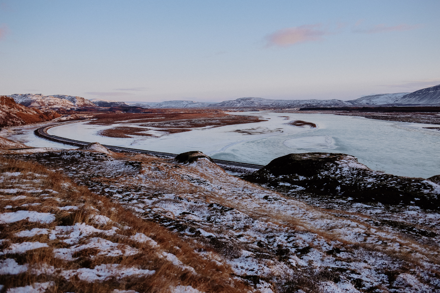 Das einzig unangenehme: Wind und Schnee. Kaum waren wir aus der Stadt, waren die Straßen verschneit und der Wind wehte immer mehr Schnee über die glatten Fahrbahnen. Nachdem wir allerdings am Aussichtspunkt vor Pingvellir viele Individualreisende in ihren Mietwagen getroffen haben, war mir nicht mehr ganz so mulmig zumute und ich konnte die Natur viel mehr genießen.